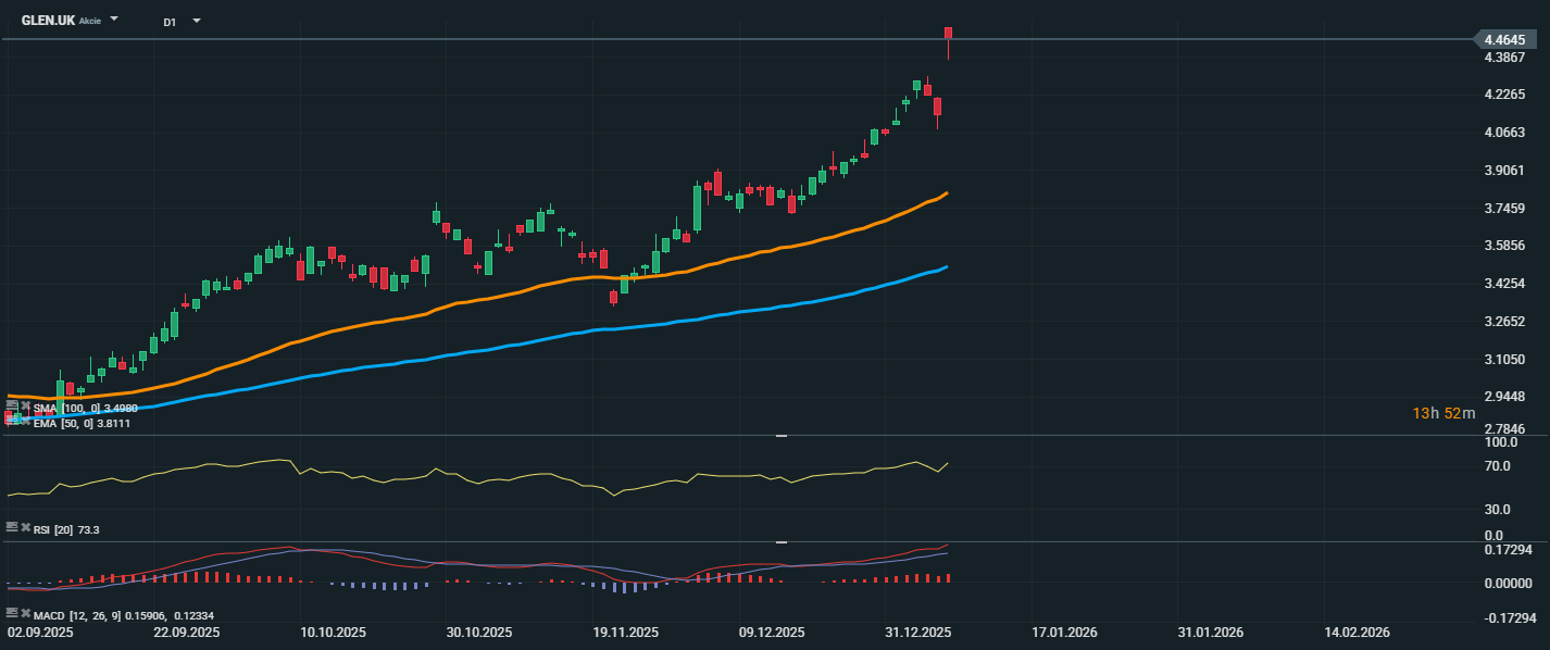 Akcie Glencore vystoupaly až na 4,5 GBP, následně však prudce oslabily na přibližně 4,38 GBP a nyní se obchodují kolem 4,47 GBP. Cena akcií se drží vysoko nad EMA 50 (3,81 GBP) a SMA 100 (3,49 GBP), přičemž RSI se nachází na výrazně překoupené hodnotě 73,3, což zvyšuje pravděpodobnost další korekce.