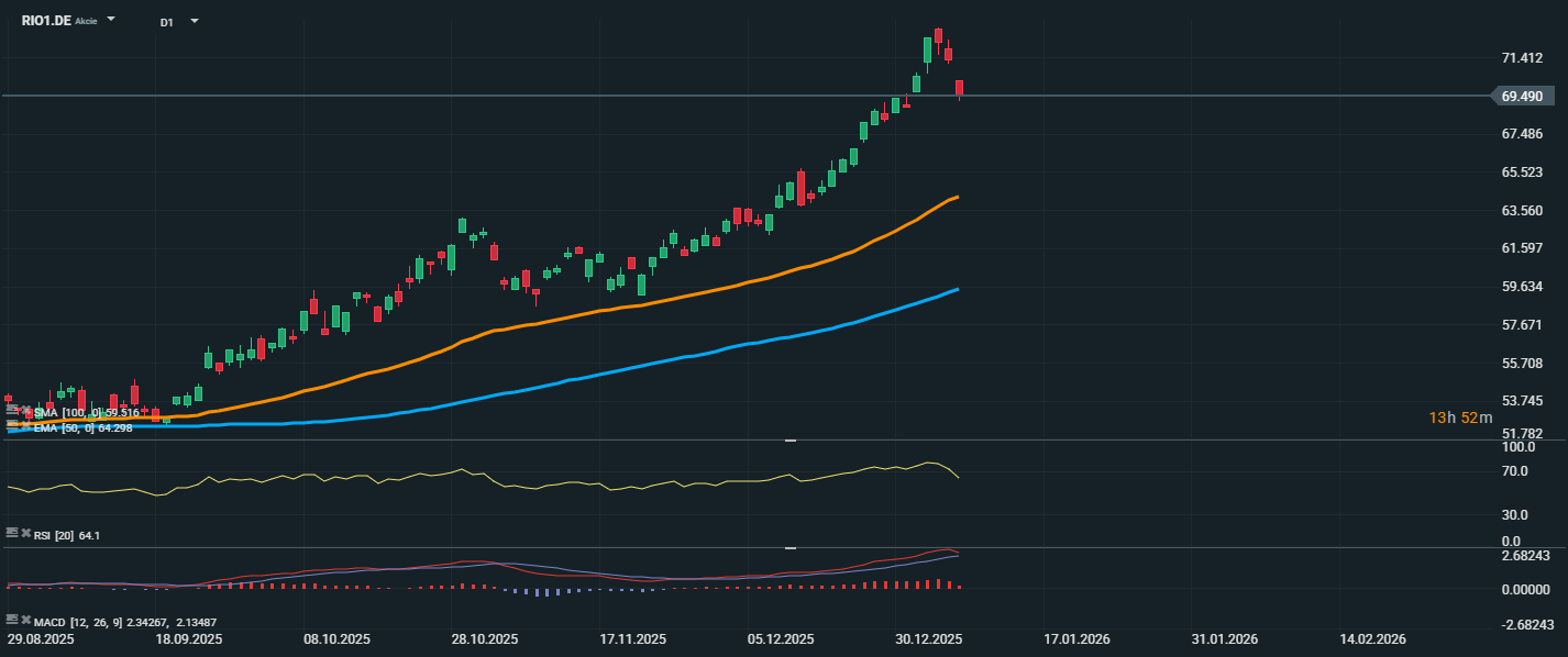 Cena akcie Rio Tinto se po silném růstu dostala až k úrovni 72,9 EUR, odkud následně mírně oslabila na současných 69,49 EUR. Stále se však obchoduje vysoko nad klouzavými průměry EMA 50 (64,29 EUR) i SMA 100 (59,51 EUR), což ukazuje na pokračující dlouhodobě pozitivní trend. RSI se nachází na hodnotě 64,1, tedy těsně pod překoupeným pásmem, což naznačuje možné krátkodobé ochlazení nákupního zájmu.