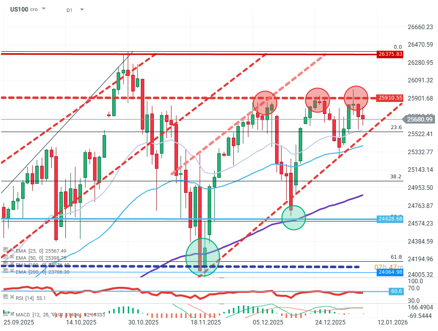 Kupující mají jasný problém překonat rezistenční zónu kolem úrovně 25 900 bodů. Růstové momentum na konci roku 2025 zřetelně oslabilo a stále čelí překážkám. Trh se již třikrát odrazil od této úrovně, což zvyšuje pravděpodobnost korekce směrem k pásmu mezi úrovněmi FIBO 23,6 a 38,2.