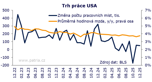 Nedá se říci, že by prosincový report z amerického trhu práce vyšel přesně podle představ. Na druhou stranu ale jdou odchylky od očekávání proti sobě a celkový obrázek se příliš nemění. Nekoná se další velké ochlazení ani podstatný obrat k horšímu. A to za současné situace finančních trhům bude stačit. Klíčovou implikací je, že Fed může pokračovat v uvolňování měnové politiky a její výhled se nijak zvlášť nemění. Zaměstnanost se za prosinec zvedla o 50 tisíc namísto očekávaných 70 k. Navíc revize listopadu míří dolů na 56 tisíc. Podstatně hůře pak vypadá revidovaný říjen, kdy ubylo podle nových dat 173 tis. pracovních míst, to se ale vracíme do shutdownu, který už dávno není relevantní. Data ze soukromého sektoru byla za prosinec rovněž horší než konsensus, a to ještě trochu výrazněji než ta celková. Hlavní příspěvky k tvorbě pracovních míst přišly z oblasti školství a zdravotnictví a z pohostinství. Naopak místa ubývala v průmyslu a stavebnictví, v obchodě a dopravě a mírně také ve specializovaných službách. Naproti tomu z průzkumu mezi domácnostmi ale vyplývá, že se kolem 232 tisíc lidí přesunulo ze skupiny nezaměstnaných mezi zaměstnané. Míra nezaměstnanosti negovala předchozí mírný nárůst a vrátila se na 4,4 procenta. Pracovní síla mírně klesla. Lépe, než se čekalo, se vyvíjejí také mzdy, které v prosinci stouply o 0,3 procenta meziměsíčně a 3,8 procenta meziročně. V obou případech došlo k překonání odhadů a revizi listopadové dynamiky k lepšímu. Celkový objem mezd drží meziroční dynamiku mírně nad 4 procenty, což stačí na reálný růst kolem 1,5 procenta. Celkově vzato sice zaměstnanost naznačuje, že trh práce je poměrně slabý. Za celý rok generoval průměrně jen 49 tisíc pracovních míst a trend míří dolů. Shutdown samozřejmě s čísly podstatně hýbal, ale už je nějaký čas za námi a jeho vliv byl krátkodobý, nikoli trendový. Naproti tomu ale nedochází k podstatnému propadu zaměstnanosti, který by ohrožoval růst ekonomiky. Navíc mzdová dynamika se lehce zlepšila a spotřeba je z historického pohledu výrazně závislá na bohatých domácnostech, jejichž chování určují daleko více akciové trhy než trh práce. Právě v tomto kontextu podle nás k datům přistupují hráči na finančních trzích: Trh práce neohrožuje ekonomiku a zároveň nechává Fedu prostor k dalšímu postupnému snižování sazeb. Nad rychlostí snižování sice panují a budou panovat pochybnosti, ale směr zůstává pevný, a to je nejpodstatnější. Lehce nervózní reakce dluhopisů či dolaru by tak měla rychle odeznít, sentiment by měl zůstat převážně pozitivní a klíčovým tématem pro trhy zůstane umělá inteligence.