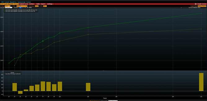 Když se podíváme na českou výnosovou křivku dnes a před rokem, její většinová část leží citelně výše. Zejména u delších splatností státních dluhopisů: například výnos desetiletého je vyšší o více než 25 bazických bodů a u třicetiletého o více než padesát. Půjčujeme si tedy dráž.