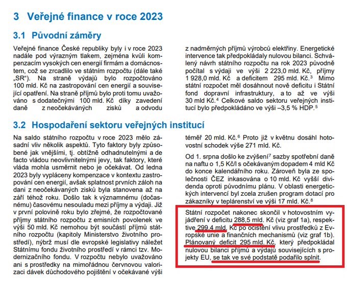 Poslední citovaná věta je zásadní. Rada totiž konstatuje splnění plánovaného deficitu, které ale striktně vzato platí za daný rok pouze při uplatnění vyčíslení schodku se zahrnutím pozice vůči EU a finančním mechanismům. Při tomto zahrnutí, v neočištěné podobě, totiž za rok 2023 vzniká schodek 288,5 miliardy Kč, který je tedy nižší než údaj 295 miliard Kč. Zatímco v očištěné podobě vzniká deficit 299,4 miliardy Kč, který je vyšší než údaj 295 miliard Kč, takže schodek splněn není.