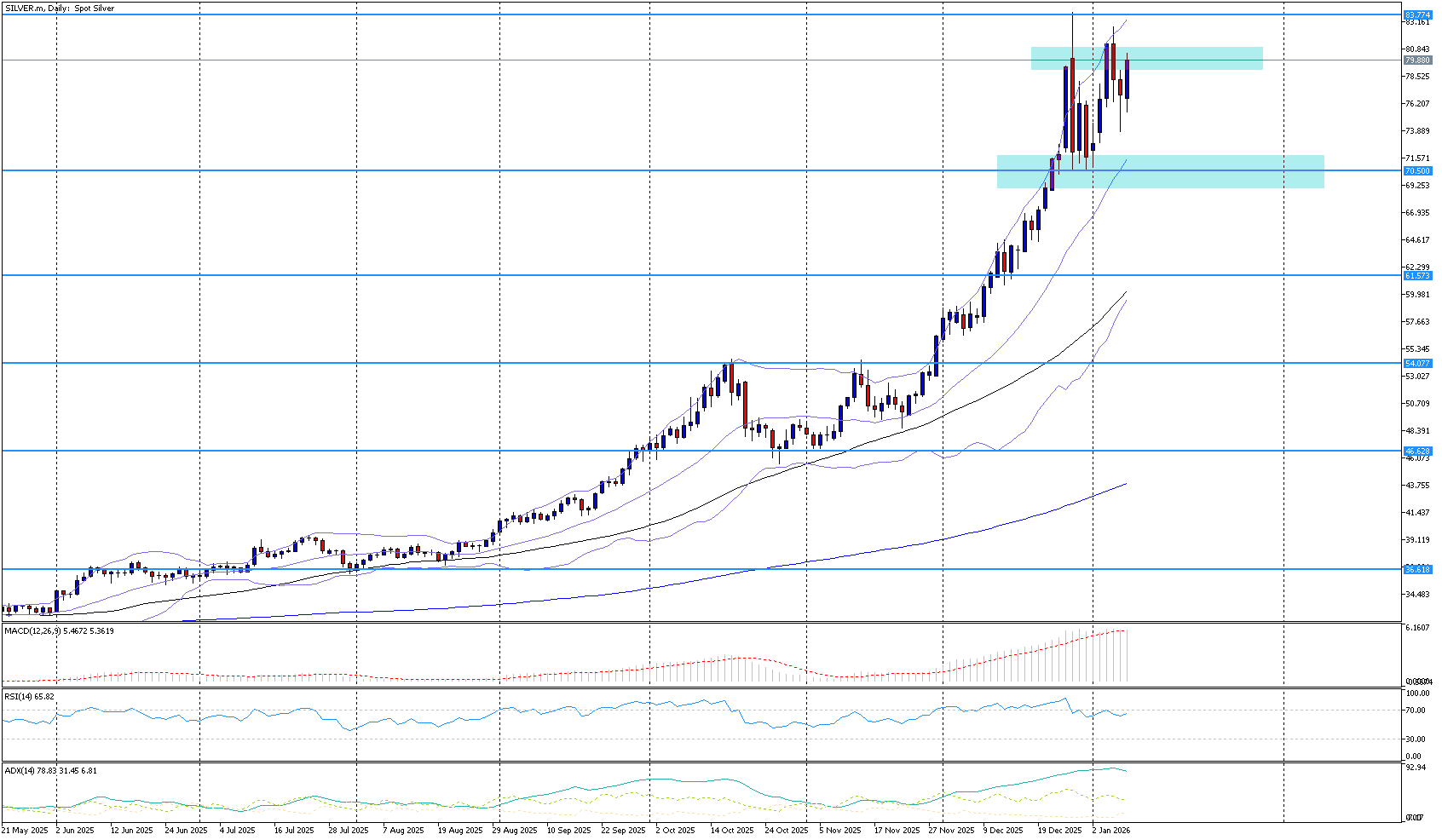 Stříbro se po dvou po sobě jdoucích ztrátových seancích stabilizuje poblíž úrovně 78,00, když investoři přistoupili k realizaci zisků po předchozím prudkém růstu. Od Vánoc se cena pohybuje v relativně širokém pásmu 71,00–81,00, přičemž tento konsolidační pohyb vyústil v nové intradenní maximum na úrovni 83,95 dne 29. prosince. Převládající vzestupný trendový kanál, který se formuje od listopadu, zůstává i přes krátkodobé výkyvy prakticky neporušený. Fundamentální prostředí navíc zůstává pro stříbro příznivé. Trh reaguje na geopolitický faktor poté, co Čína oznámila zavedení kontrol vývozu stříbra, což zvyšuje obavy z možného globálního nedostatku nabídky. Tyto zprávy posilují strukturální podporu cen a přispívají k přetrvávajícímu zájmu investorů o tento drahý kov. Technické indikátory nadále potvrzují silnou vzestupnou dynamiku. RSI se pohybuje těsně pod hranicí překoupenosti, což naznačuje, že růstový impuls zatím není vyčerpaný. MACD zůstává v silně pozitivním teritoriu a drží se blízko své signální linie, zatímco ADX prudce roste nad úroveň 30. Výrazná převaha linie DI+ nad DI− potvrzuje, že býci mají nad trhem jasnou kontrolu. Cenový vývoj zároveň zůstává výrazně nad krátkodobými, střednědobými i dlouhodobými klouzavými průměry a nad vzestupnou trendovou linií vedenou od září, což podtrhuje sílu aktuálního trendu. Pokud budou kupci pokračovat v aktivitě, stříbro by se mohlo pokusit o rozhodující průlom nad psychologickou hranici 80,00. Následně by se otevřel prostor pro posun směrem k úrovni 85,00, kde by mohlo dojít k vytvoření nového historického maxima. V případě korekčního pohybu by první významná podpora měla ležet v oblasti 69,00–72,00, kde se nachází 20denní SMA. Hlubší pokles by mohl být zachycen až u úrovně 61,00, kde se 50denní SMA sbíhá s dolním Bollingerovým pásmem a vytváří silnou technickou bariéru. Celkově však zůstává výhled pro stříbro výrazně býčí, dokud jsou klíčové podpory respektovány.
