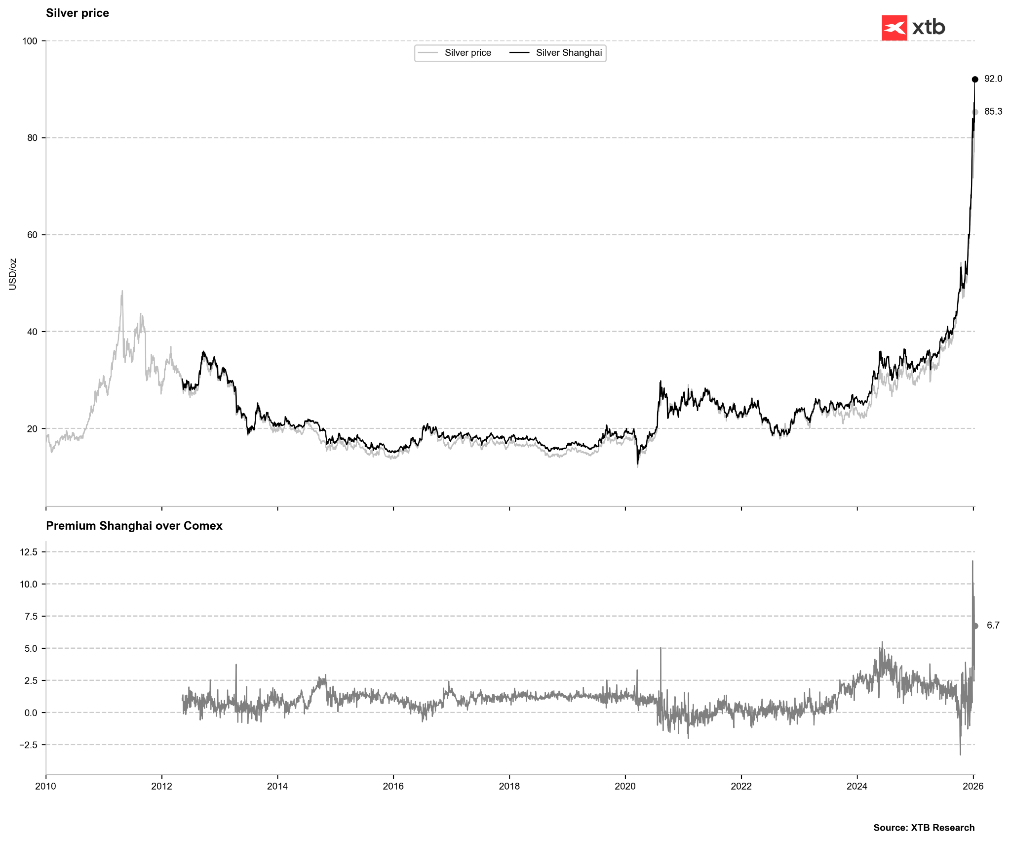 Zároveň rostou akutní obavy ohledně dostupnosti fyzického kovu v Číně. Na Šanghajské burze zlata (SGE) ceny stříbra překročily hranici 90 dolarů za unci.