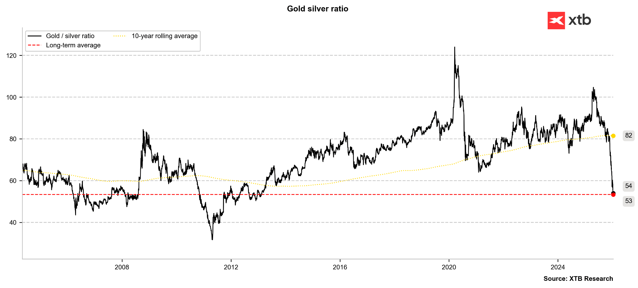 Je pozoruhodné, že dosavadní obavy z výrazného poklesu otevřených pozic na burze COMEX v důsledku rebalancování komoditního indexu se zatím nenaplnily. Investoři však pozorně sledují poměr zlata a stříbra, který se v současné době blíží historickému průměru přibližně 50–53 bodů. Ačkoli tento poměr během minulých býčích trhů s drahými kovy poklesl, návrat k průměru zůstává silnou silou. Pro kontext, 10letý klouzavý průměr poměru se pohybuje těsně nad 80 body, což je výrazně nad současnými 54 body.