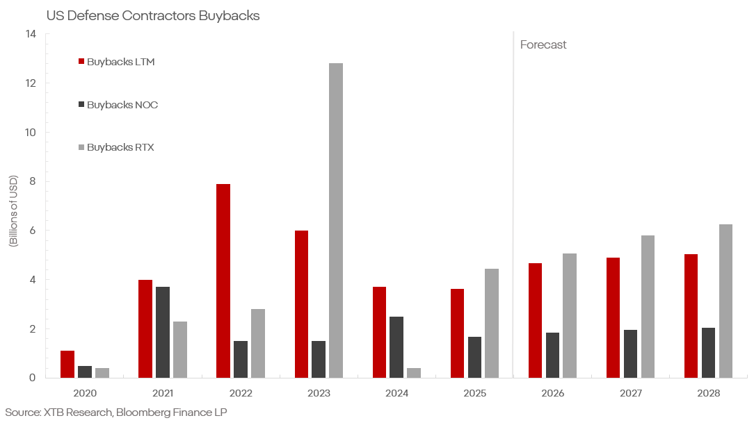 Tzv. „velká trojka“ amerického obranného průmyslu – Raytheon, Lockheed Martin a Northrop Grumman – v letech 2022–2024 alokovala téměř 40 miliard USD právě na odkupy akcií.