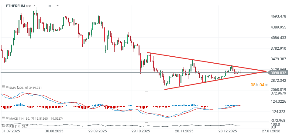 Ethereum se obchoduje v rámci symetrického trojúhelníku, což je formace, která obvykle značí pokračování dominantního trendu (v současnosti klesajícího). Zároveň ale cenová akce vykazuje vyšší minima. Pokles pod 3 000 USD by mohl obnovit prodejní tlak a spustit další medvědí impuls, zatímco růst nad 3 300 USD by zvýšil šanci na proražení směrem vzhůru. Nastavení naznačuje, že fáze konsolidace a nízké volatility se může blížit ke konci.