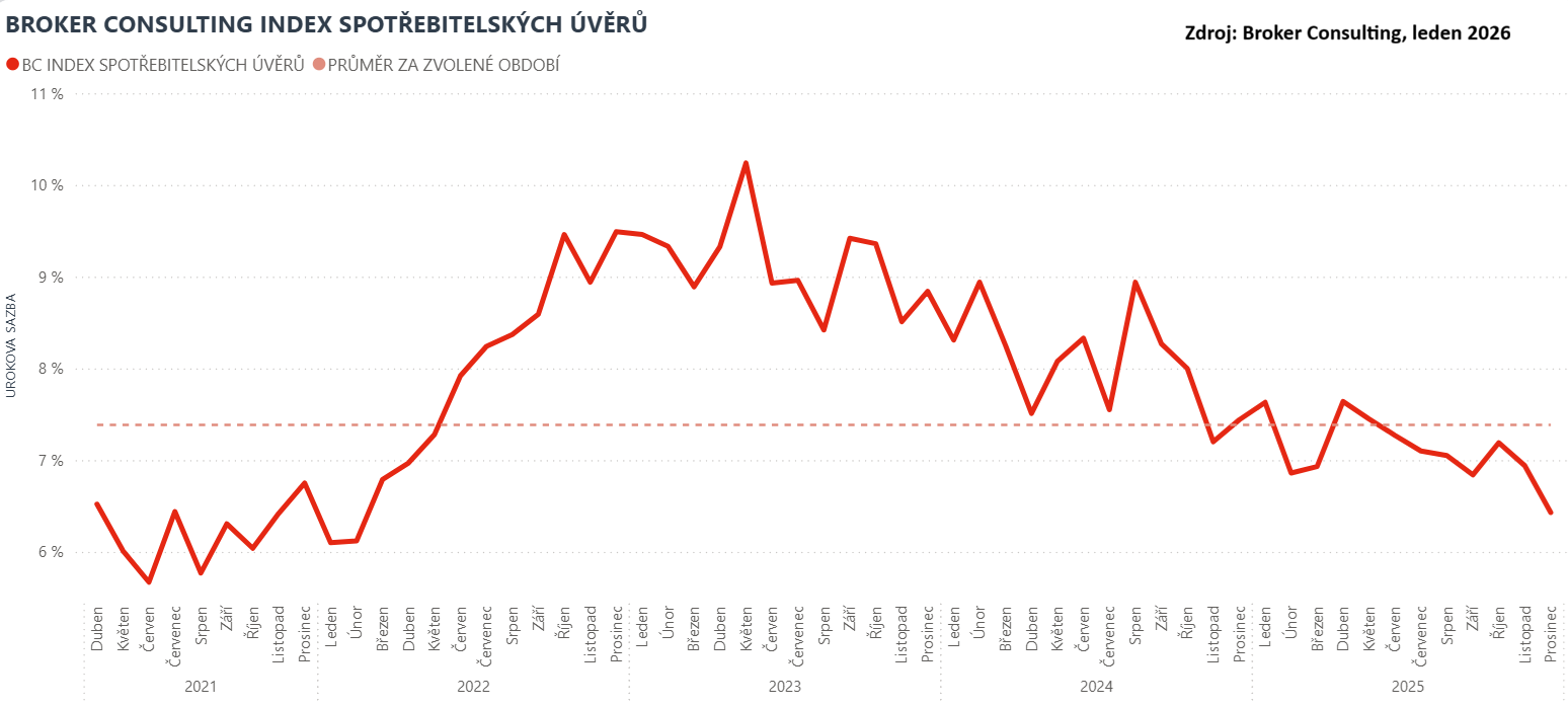 Broker Consulting Index spotřebitelských úvěrů dosáhl v prosinci hodnoty 6,43 %. Oproti listopadu tak průměrná sazba klesla o výrazných 0,51 procentního bodu a zařadila se mezi nejnižší hodnoty roku 2025. Zároveň se průměrná sazba dostala na nejnižší úroveň za posledních 46 měsíců. Nižší hodnota byla zaznamenána naposledy v únoru 2022 (6,12 %).