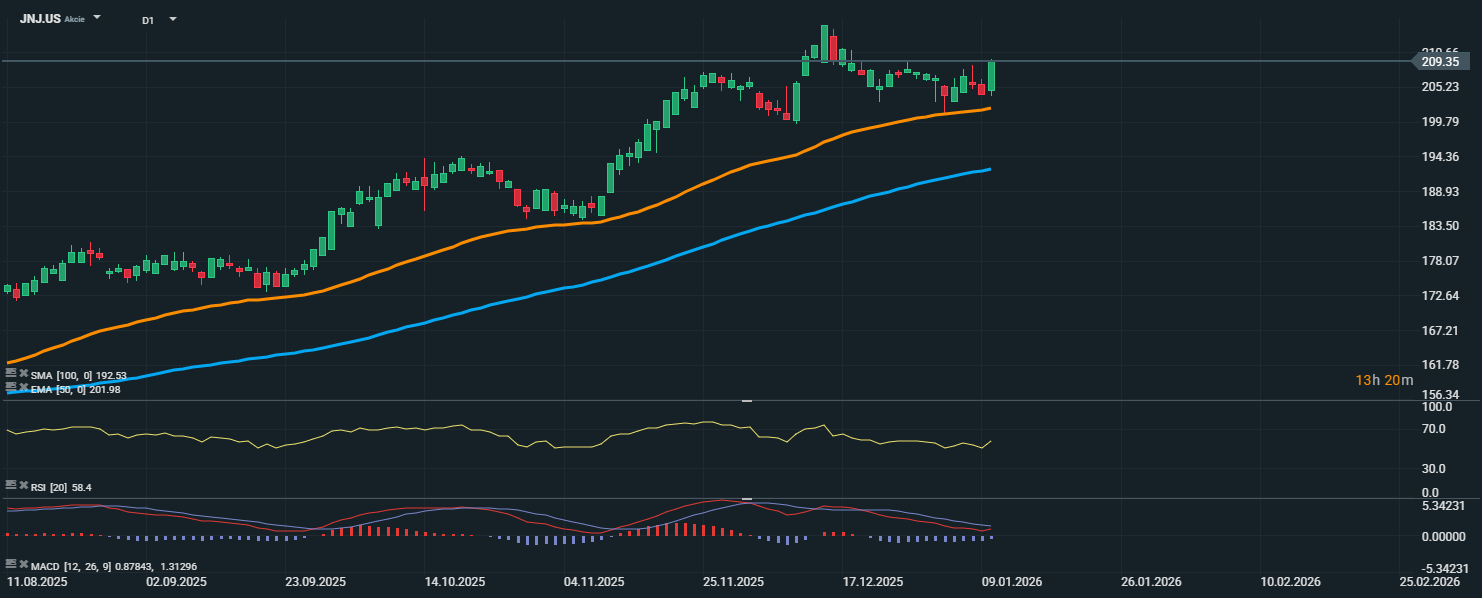 Akcie společnosti Johnson & Johnson se aktuálně obchodují na úrovni 209,35 USD, což znamená návrat k lokálním maximům dosaženým začátkem ledna 2026. Cena se drží nad klouzavými průměry EMA 50 (201,98 USD) i SMA 100 (192,53 USD), což potvrzuje dlouhodobé býčí technické nastavení. RSI se nachází na hodnotě 58,4, tedy v mírně překoupené zóně, ale stále daleko od extrému.
