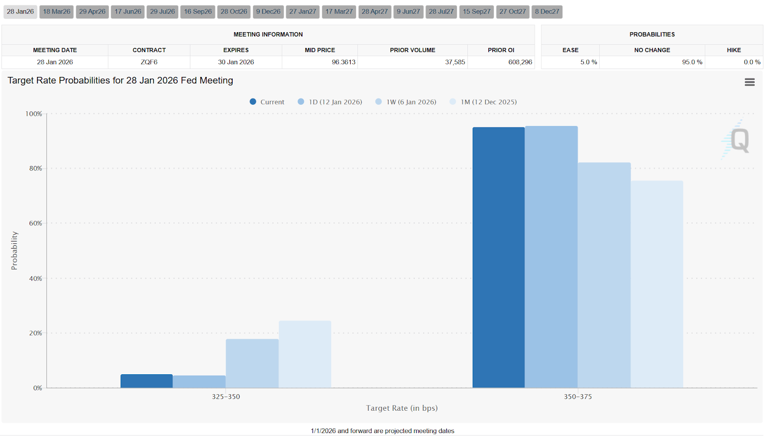 Trh nyní oceňuje přibližně 95% pravděpodobnost, že Fed na příštím zasedání ponechá sazby beze změny. Tvůrci politiky budou sledovat dopad cel na ceny, ale většina výhledů počítá s tím, že inflace bude v roce 2026 postupně klesat. Dezinflační tlaky v oblasti bydlení a slabší růst mezd by měly převážit nad vlivem cel.