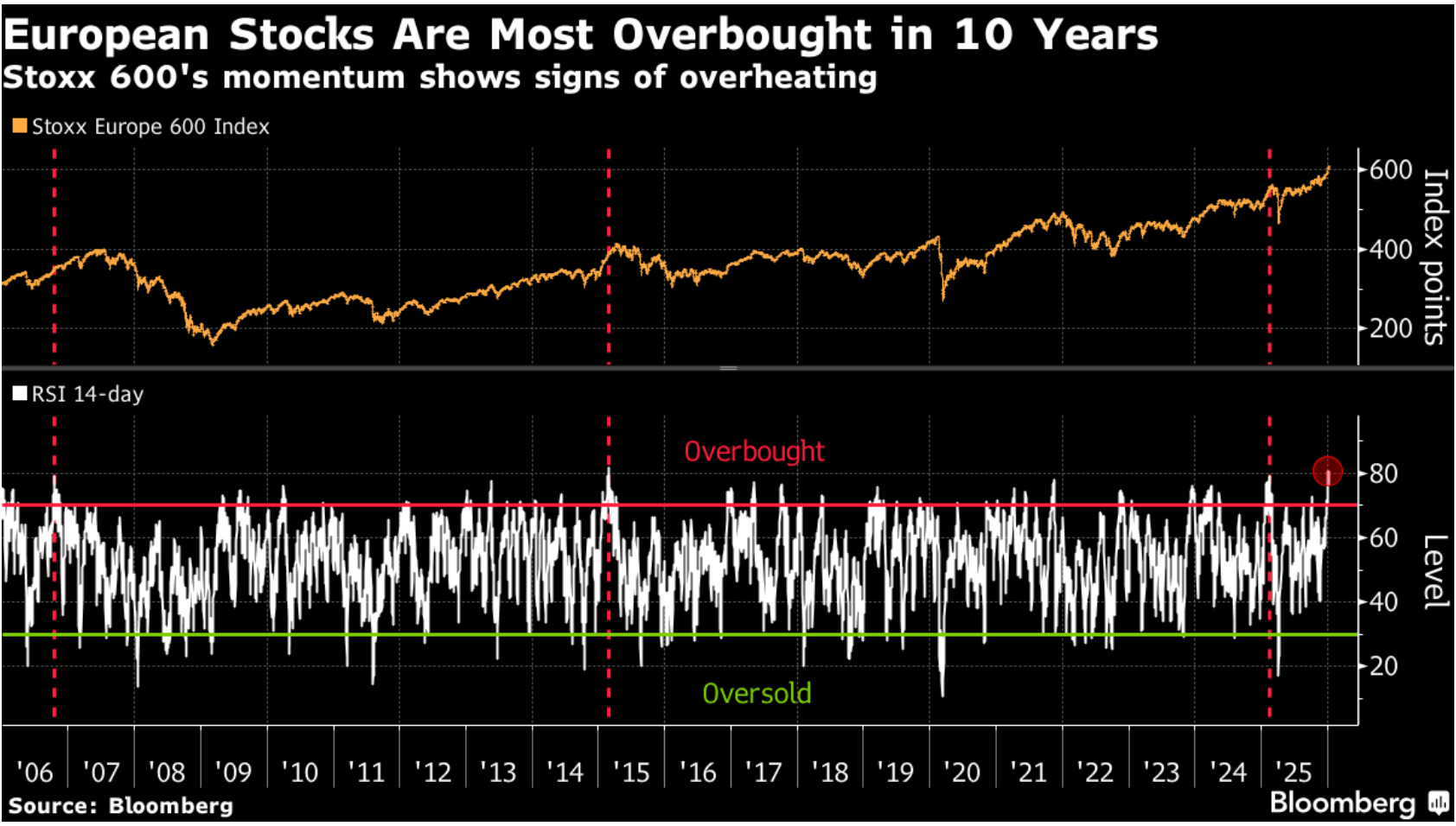 Evropský akciový trh, reprezentovaný indexem Stoxx Europe 600, si vedl pozoruhodně dobře – v roce 2025 vzrostl o 17 % a v úvodu roku 2026 přidal dalších 3,2 %, čímž překonal výkon amerického indexu S&P 500. Index však vykazuje známky přehřátí – 14denní RSI překročil hranici 80, což se za posledních 20 let stalo jen zřídka a naznačuje riziko konsolidace nebo blížícího se vrcholu. Analytici Oddo BHF a Société Générale varují před příliš rychlým růstem valuací, zejména v cyklických sektorech, vzhledem k slabému hospodářskému růstu (prognóza 1,2 % v roce 2026) a stagnujícím firemním ziskům v loňském roce.