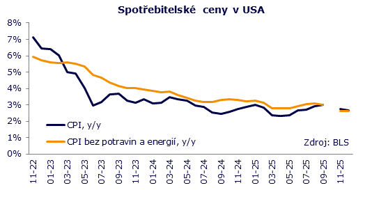 Také inflační data ze zámoří byla postižena výpadkem vládního financování, když říjnové statistiky nevyšly vůbec a za listopad chybí velká většina detailů. S prosincem se ale vracíme do normálu co do zveřejňování dat, přičemž samotná inflace kopíruje listopadové hodnoty. Úroveň jádrové inflace je sice mírně pod odhady, ale celkově data zapadají do předpokladu velmi pozvolného zpomalování cen v ročním výhledu. Prosinec znamenal nárůst spotřebitelských cen o 0,3 procenta, přičemž jádrový index stoupl o 0,2 pct. Meziroční inflace pak stojí na 2,7, respektive jádrová na 2,6 procenta (při konsensu v obou případech 2,7). Hlavní index tentokrát táhly citelně nahoru potraviny (meziměsíčně +0,7 pct) a přidalo se také bydlení (+0,4 pct). Energie zdražovaly stejným tempem jako index. Naopak brzdou pro inflaci byla auta, neboť cena nových vozů stagnovala a ojetiny zlevnily z měsíce na měsíc o 1,1 pct. Přestože inflaci brzdila poměrně volatilní položka aut, na druhé straně máme rovněž dost nestálé potraviny. Služby bez bydlení, tedy něco jako super jádrová inflace, zdražily o 0,2 pct, což je příznivě nízké tempo naznačující, že poptávka nestimuluje ceny nějak výrazně. Podobné tempo u zboží pak ukazuje, že předvánoční sezóna nenechala obchodníkům mnoho prostoru pro promítnutí vyšších cel, tj. ceny příliš nevybočily z typického sezónního chování. Drobné podstřelení odhadů na jádrovou inflaci přináší zisky akciím i dluhopisům a mírně doléhá na dolar. Po vyprchání úvodní reakce jsou změny už pouze drobné, ovšem data i tak přispívají k postupnému vylepšení sentimentu, který byl zrána spíše negativní. Podstatné změny očekávání o měnové politice z inflačních dat nevyplývají.