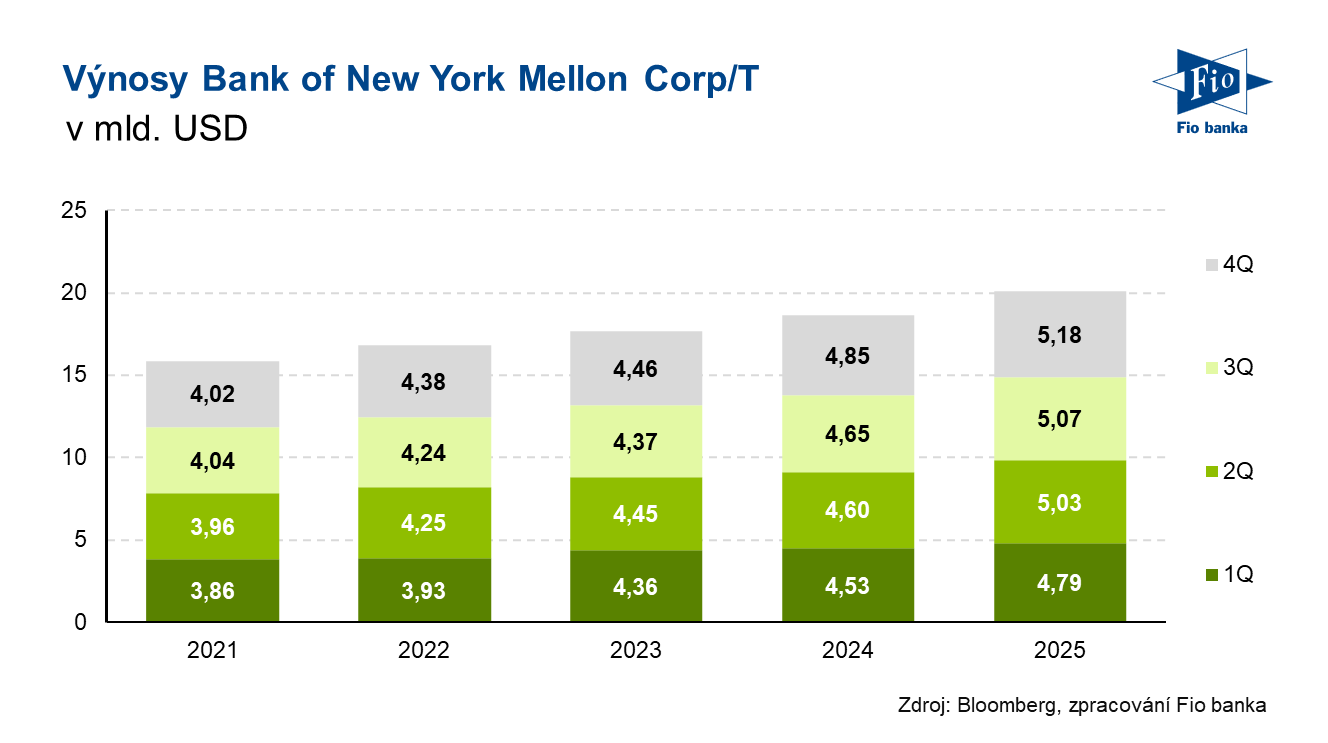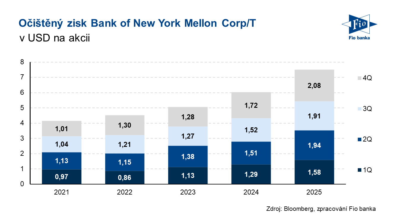 Klíčová slova: New York | Kapitál | Akcie | Aktiva | Bloomberg | CEO | Dividendový výnos | Marže | P/E | Ukazatel | Výnos | Zisk na akcii | USD | Zisk | Výsledky | EPS | Banka | Fio banka | Cena | Fio | Fiskální rok | Trh | Cílová cena | Čistá úroková marže | ROCE | ROE | Bank of New York Mellon | Kapitalizace | Výhled | Konsensus | Odhady trhu | Výnosy | Očekávání | Kvartální výsledky | Očekávání trhu | Čistý zisk | Generální ředitel | Miliardy | Hospodaření | Návratnost | Výsledky hospodaření | Meziroční růst | Americká společnost | Vývoj | Růst | Růst výnosů | Rentabilita | Vývoj akcie | Čisté úrokové výnosy | Úrokové výnosy | Společnosti | Společnost | Výsledky společnosti | 3М | Miliardy USD | Jakub Němec | Aktiva pod správou | Tržní odhad | Očištěný zisk na akcii | Rentabilita vlastního kapitálu | Fio banka, a.s. | Rok 2025 | Rok 2026 |