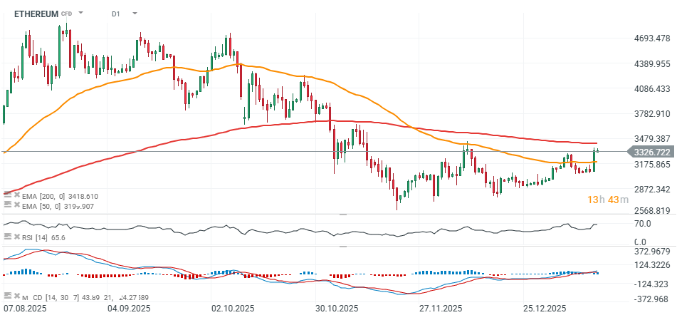 Ethereum prodlužuje růstovou sérii již pátou obchodní seanci poté, co trh pozitivně reagoval na významnou aktualizaci sítě. Sentiment dále podporuje rozhodnutí CFTC, která nově umožní využívat bitcoin, ether a USDC jako kolaterál pro derivátové obchody. K příznivému prostředí přispívají také očekávané čtvrteční rozhovory mezi šéfy bank a americkými senátory, jež podtrhují postupné otevírání regulačního rámce kryptoměnám a rostoucí prostor pro institucionální adopci. Největší altcoin však nyní naráží již druhým dnem na silnou rezistenci v podobě 50denního SMA poblíž 3 330 USD – hladiny, kterou trh nepřekonal od 13. listopadu. -