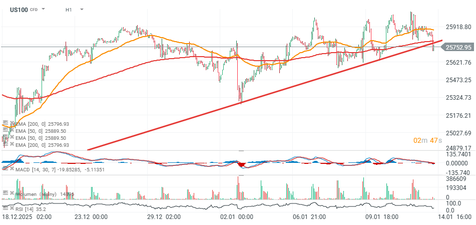 Před klíčovými americkými makrodaty a rozhodnutím Nejvyššího soudu USA ohledně cel zůstává sentiment kolem amerických akciových indexů značně negativní. Navzdory včerejším povzbudivým údajům o CPI trhy tuto zprávu z velké části ignorovaly a akcie zakončily den poklesem. Futures na Nasdaq 100 (US100) klesají o více než 0,5 %, zatímco VIX roste o přibližně 3 %. Pokud se US100 rychle nevrátí nad 25 800, mohou mít býci problém udržet růstový moment v krátkodobém horizontu. Index byl v poslední době čtyřikrát odmítnut v oblasti 26 000 bodů a nyní se propadl pod dva klíčové klouzavé průměry – 50- a 200-periodový EMA. RSI klesá směrem k 35, ale zatím nedosáhl přeprodaného pásma.