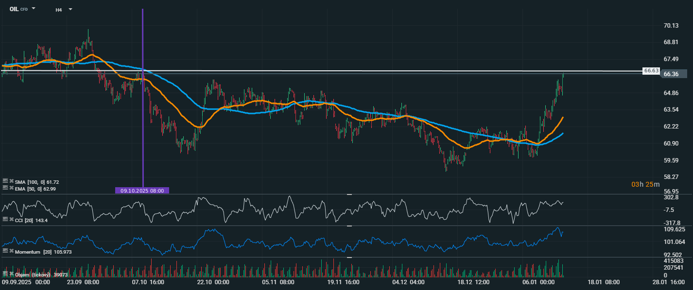 Cena ropy zaznamenala prudký růst a dosáhla úrovně 66,36 USD. Aktuální růst přichází po jednoznačném průrazu nad klouzavé průměry EMA 50 (62,99 USD) a SMA 100 (61,72 USD), což potvrzuje obrat trendu do býčího nastavení. CCI se nachází na úrovni 143,4, což značí výraznou překoupenost trhu. I Momentum ukazuje na silné tempo růstu s hodnotou přesahující 105. Objem obchodů během růstové fáze také výrazně narostl, což podporuje věrohodnost pohybu.