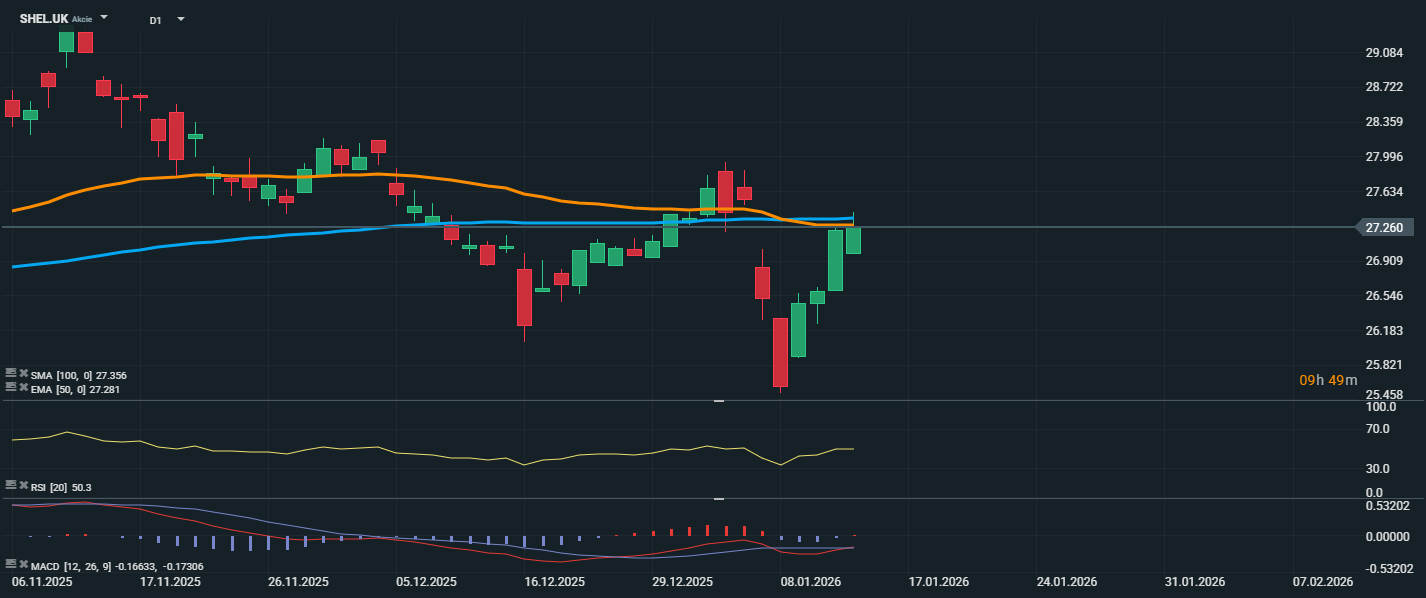 Denní graf akcií Shell ukazuje na technicky klíčovou situaci, kdy cena testuje zónu klouzavých průměrů EMA 50 (27,28 GBP) a SMA 100 (27,35 GBP). Tyto hladiny představují významnou rezistenci, kterou se trhu zatím nepodařilo přesvědčivě prorazit. Po prudkém propadu z počátku ledna došlo k rychlému oživení a cena se nyní stabilizovala kolem úrovně 27,26 GBP. RSI se nachází na hodnotě 50,3, což značí neutrální pásmo, bez známek překoupenosti či přeprodanosti. Z pohledu struktury cenového vývoje může být aktuální růst stále součástí korekce v rámci předchozího klesajícího trendu. K potvrzení obratu směrem vzhůru by bylo třeba průrazné uzavření nad 27,40–27,60 GBP, čímž by cena překonala nejen klouzavé průměry, ale i nedávné swingové maximum. Naopak zamítnutí na této úrovni může vést k návratu k podpoře v oblasti 26,20–26,50 GBP, kde probíhala předchozí konsolidace.