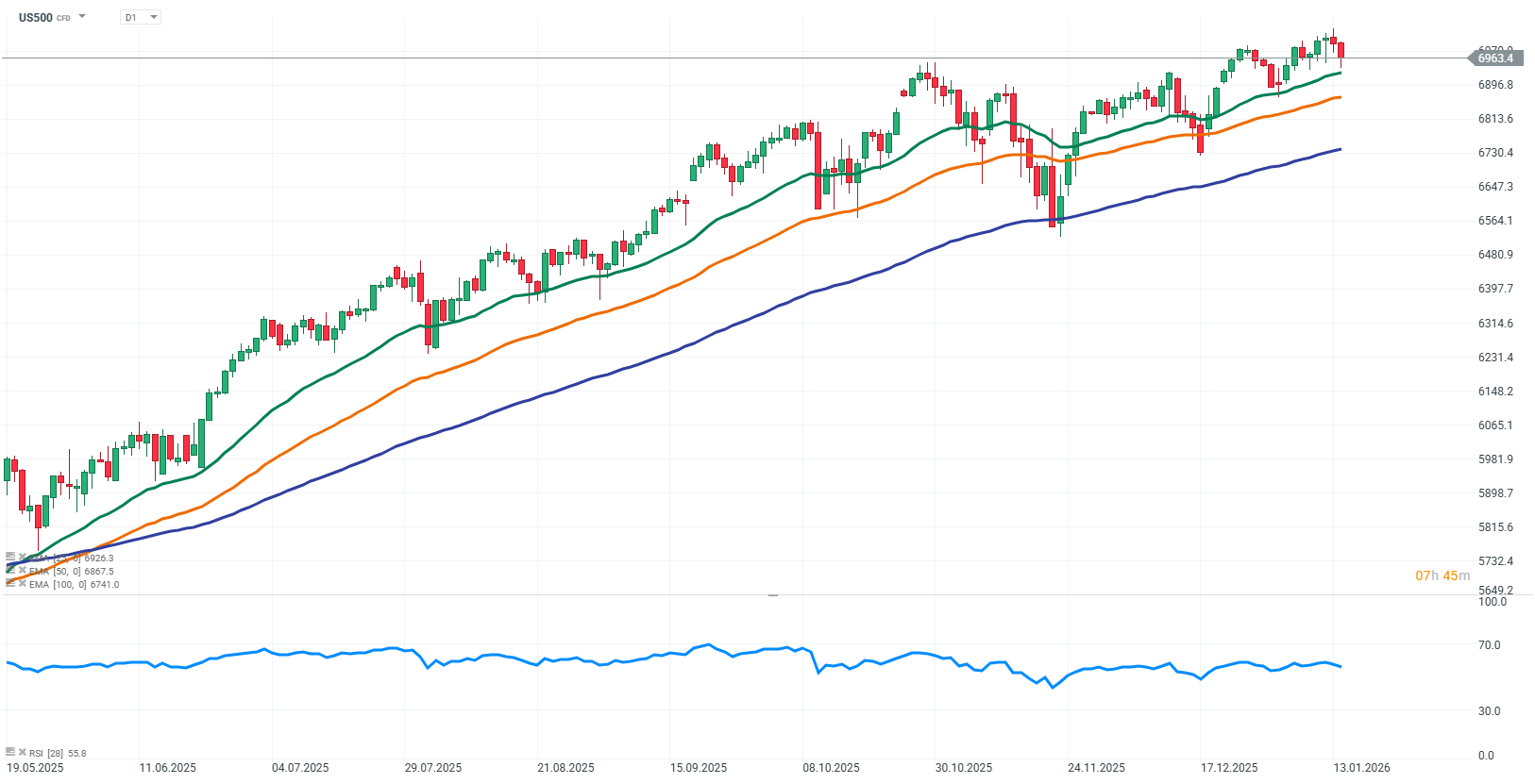 US500 oslabuje po vyšším než očekávaném PPI – trh přehodnocuje očekávání ohledně sazeb Fedu. Futures na US500 (S&P 500) dnes oslabují ve srovnání se včerejším závěrem, a to především v reakci na vyšší než očekávaný index PPI, který naznačuje přetrvávající inflační tlaky a snižuje očekávání trhu na rychlé snížení sazeb ze strany Fedu. Jádrový PPI nad konsenzem vyvolal obavy z pokračování aktuální měnové politiky. Indikátor RSI klesá směrem k 50, což signalizuje neutrální momentum a možnost další korekce po rekordních úrovních z prosince.