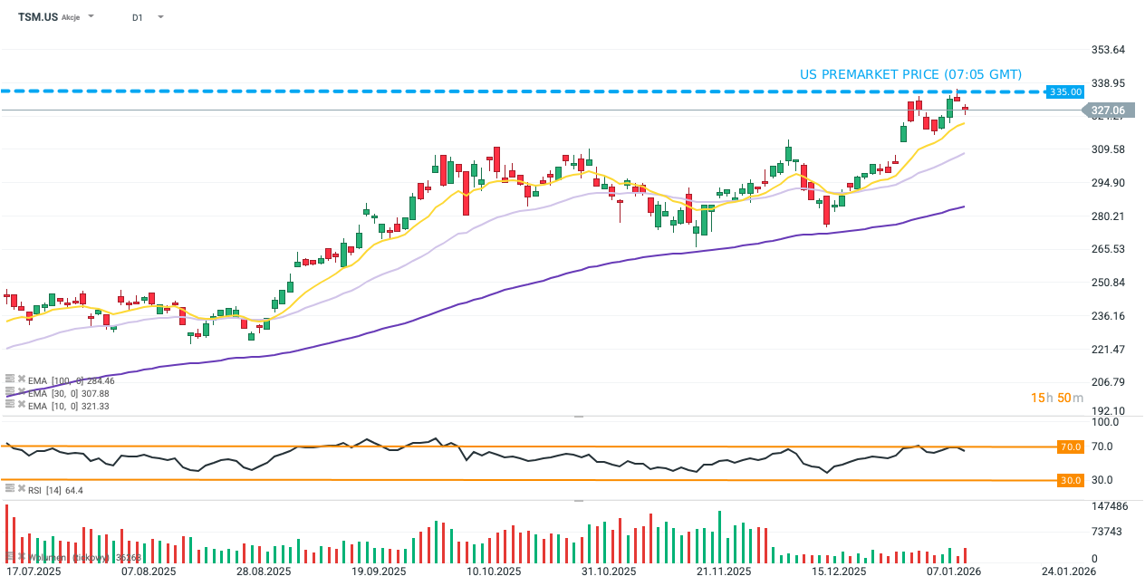 Akcie TSMC v premarketu na Wall Street rostou přibližně o 2,5 %, a to i přes skutečnost, že denní RSI se pohybuje blízko překoupených úrovní. Cena tak vymazává ztráty z předchozích dvou seancí, které byly způsobeny nervozitou před zveřejněním výsledků. Kupující však zůstávají opatrní, pokud jde o prorážení nového historického maxima.