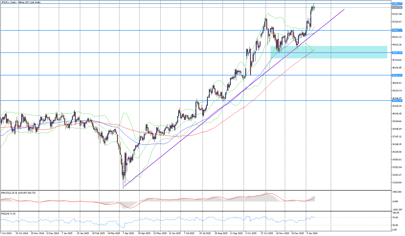 Hotovostní index JP225 během středeční asijské obchodní fáze navázal na předchozí růst a posunul se na nové historické maximum v blízkosti 54 500 bodů. Tímto pohybem dále rozvinul růstovou vlnu, která se formuje od 9. ledna. Za hlavní spouštěč aktuální rally jsou považovány spekulace o možném vyhlášení předčasných parlamentních voleb již v únoru, o nichž má uvažovat japonská premiérka Sanae Takaichi. Překonání dosavadního maxima na hladině 52 648 bodů potvrdilo vytvoření vyššího cenového vrcholu a posílilo strukturu dlouhodobého rostoucího trendu indexu Nikkei. Pozitivní náladu na trhu podporují také očekávání robustnější fiskální expanze v případě, že by Liberálně demokratická strana dokázala upevnit svou většinu v dolní komoře parlamentu. Dalším podpůrným faktorem jsou spekulace, že Bank of Japan může odložit další zvyšování úrokových sazeb, což zůstává příznivým signálem pro akciová aktiva. Tyto fundamentální vlivy se promítají do cenového vývoje, který respektuje vzestupnou trendovou linii vedenou od minima z poloviny dubna 2024. Vzhledem k pohybu indexu v neprobádaném cenovém teritoriu aktuálně chybí jasně definované technické rezistence. Nejbližší potenciální překážkou tak zůstává psychologická hranice 55 000 bodů, jejíž prolomení by mohlo otevřít prostor pro pokračování růstu směrem k oblasti 60 000 bodů. Denní technické indikátory nadále potvrzují silnou býčí dynamiku, když RSI setrvává nad úrovní 70 bodů a MACD se drží nad nulovou i signální linií s rostoucím sklonem. Současně je však nutné zohlednit i možná rizika. Politická nejistota přispěla k oslabení japonského jenu, což může vést k vyšším inflačním tlakům prostřednictvím dražších dovozů. Jakékoliv signály o dřívějším zpřísnění měnové politiky ze strany Bank of Japan by mohly vyvolat redukci rizikových pozic a korekci na akciovém trhu.