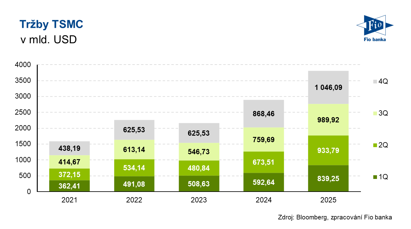 Tchajwanský výrobce polovodičů Taiwan Semiconductor Manufacturing (TSMC) oznámil výsledky hospodaření za 4. čtvrtletí roku 2025, které ve všech sledovaných klíčových metrikách překonaly průměrná očekávání analytiků. Tržby v dolarovém vyjádření meziročně vzrostly o 25,5 % na 33,73 mld. USD. Hrubá marže dosáhla 62,3 %, což je nad úrovní předchozího čtvrtletí (59,5 %) i nad konsensem analytiků ve výši 60,6 %. Společnost zároveň zveřejnila výhled na 1. čtvrtletí roku 2026, který byl rovněž lepší, než trh očekával. Firma uvedla, že výsledky byly podpořeny silnou poptávkou po jejích špičkových výrobních technologiích, přičemž očekává, že tato silná poptávka bude i nadále pokračovat.