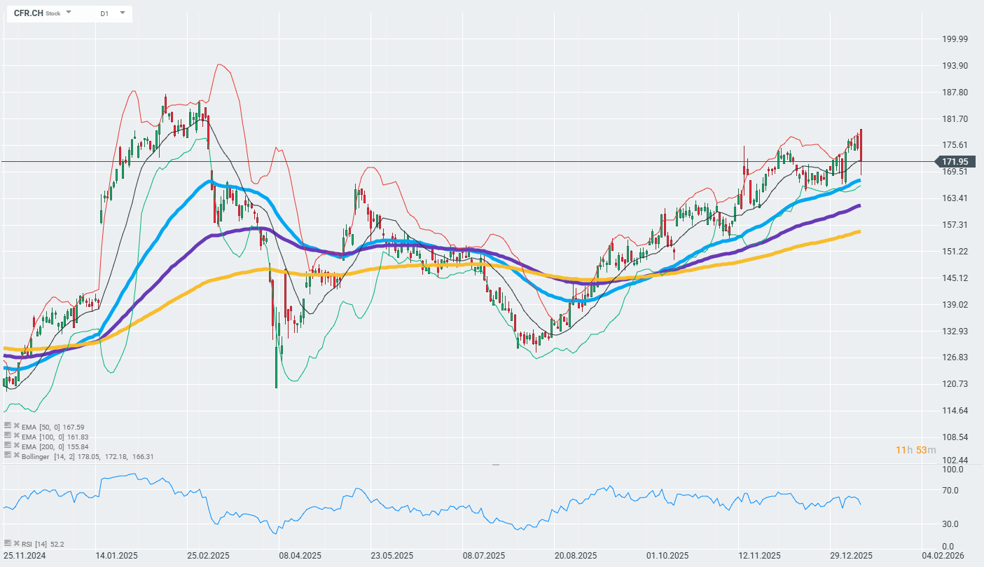 Richemont (CFR.CH), švýcarská skupina luxusního zboží (značky šperků jako Cartier a Van Cleef & Arpels a hodinářské značky jako IWC, Jaeger-LeCoultre a Vacheron Constantin) opět potvrdila svou tržní pozici a překvapila trh vyššími výsledky za období září–prosinec 2025. Tržby za toto období dosáhly 6,4 miliardy EUR, což představuje 11% nárůst při konstantních směnných kurzech a výrazně překonává odhad analytiků na úrovni 7,4 %. Výsledky překonaly očekávání díky silné globální poptávce po špercích a pokračujícímu ekonomickému oživení v Číně, která je druhým největším trhem společnosti a zároveň trendsetterem v oblasti luxusního zboží (Čína tvoří méně než 20 % celkových tržeb firmy).