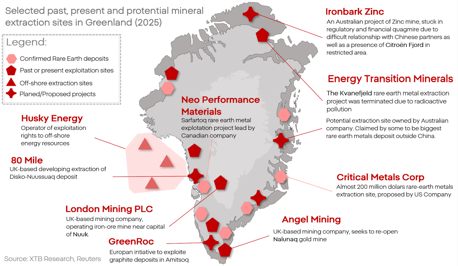 V tomto světle mnozí poukazují na zdánlivě zřejmý fakt – přítomnost obrovských ložisek mnoha nerostů (včetně tzv. vzácných zemin) na ostrově. Toto pozorování je však velmi povrchní. Grónsko sice skutečně disponuje rozsáhlými ložisky různě strategických surovin, avšak USA jako velká země má mnohem větší zásoby na svém vlastním území. Ať už jde o Skalisté hory, Mohavskou poušť, Aljašku nebo severní tajgu – tato naleziště jsou mnohem přístupnější než cokoli v Grónsku. Grónsko se nachází v arktickém kruhu a 80 % jeho povrchu pokrývá ledová pokrývka. Tato ložiska jsou natolik nepřístupná, že těžba zlata či diamantů zde není ekonomicky životaschopná. A to ani nezohledňujeme skutečnost, že USA nedisponují kapacitami pro rafinaci těchto surovin.