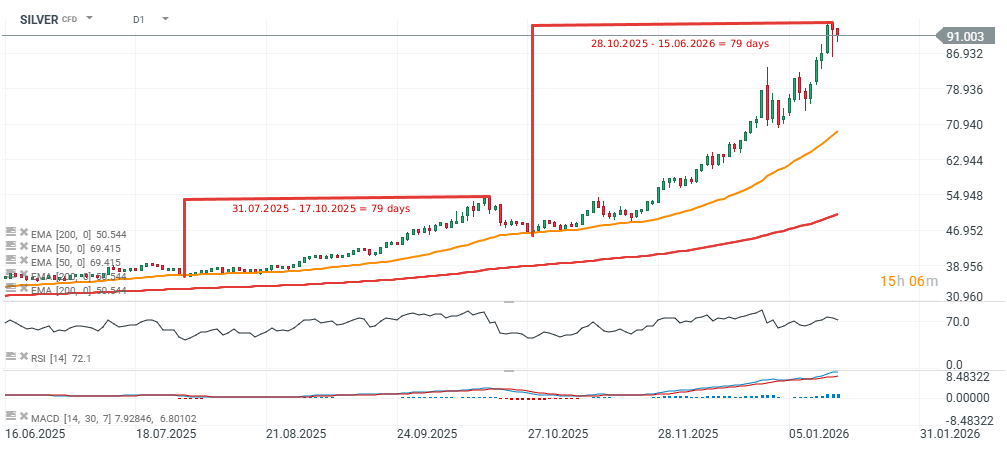 - Na grafu je patrné, že předchozí růstová vlna, která začala 31. července, trvala 79 dní, než došlo k hlubší korekci, která stáhla cenu zpět k 45 USD za unci a zaznamenala vrchol 17. října. Následně, 28. října, začala další výrazná růstová fáze, která trvá 79 dní až do dnešního dne – nyní však ceny oslabují. Tento druhý impuls přinesl zhruba dvojnásobný výnos: zatímco během pohybu v období léto–podzim 2025 stříbro posílilo o cca 53 %, v období podzim–zima došlo k růstu o více než 100 %.