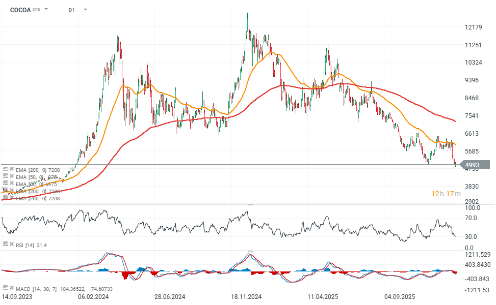 Po silných růstech v letech 2024 a 2025 je boom na trhu s kakaem už jen vzdálenou vzpomínkou – trh je už měsíce v silném downtrendu. Futures na kakao dnes klesly pod 5 000 USD za tunu, nejníže od 26. listopadu, pod tlakem slabé poptávky a zlepšujících se vyhlídek na sklizeň v západní Africe.