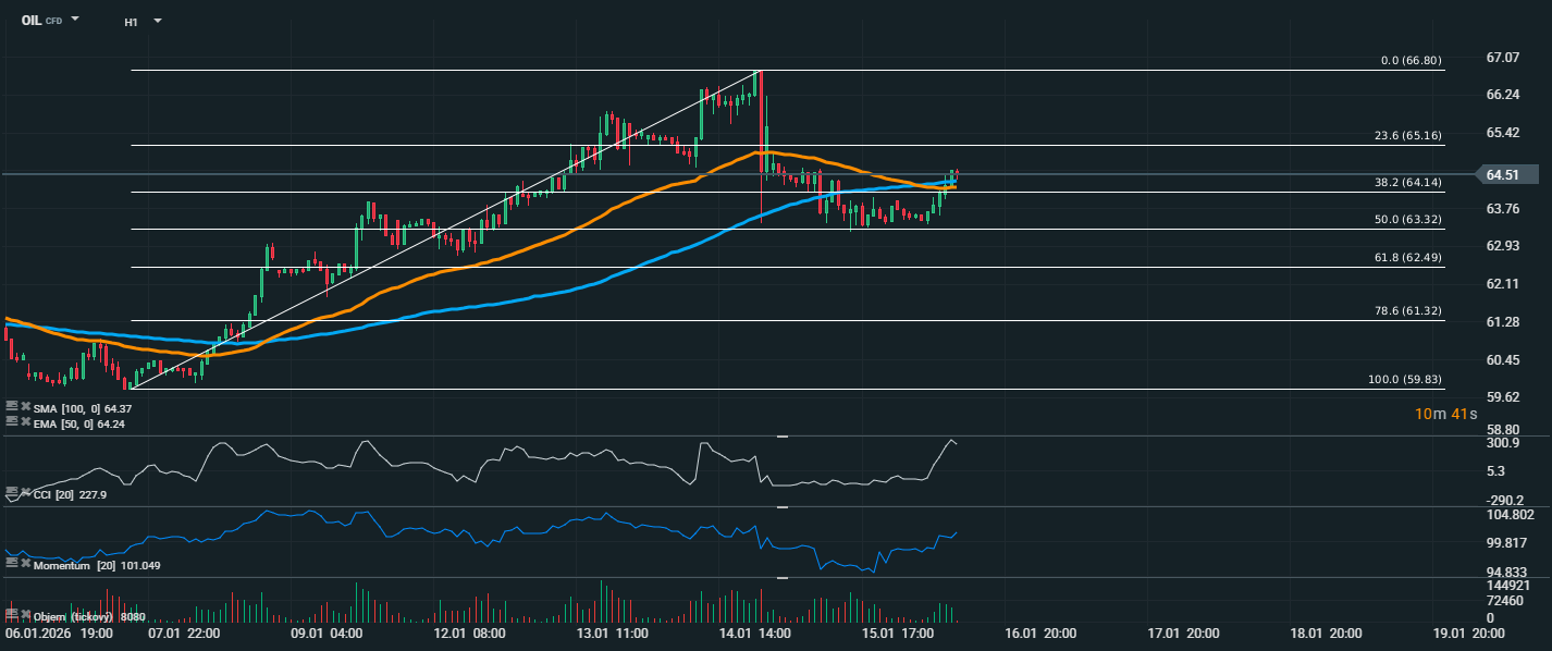 Cena ropy aktuálně obchoduje na úrovni 64,51 USD a po předchozím prudkém výprodeji se dostává zpět nad úroveň klouzavých průměrů EMA 50 (64,24 USD) a SMA 100 (64,37 USD), což je pozitivní technický signál naznačující obnovení kupního zájmu. Cena zároveň testuje úroveň 38,2 % Fibonacciho retracementu (64,14 USD) z předchozího propadu z oblasti 66,80 USD. Její udržení a potvrzení jako podpory by mohlo otevřít prostor k dalšímu růstu směrem k dalším retracementovým úrovním – především 65,16 USD (23,6 %) a následně až k lokálnímu maximu 66,80 USD. CCI se nachází hluboko v překoupeném teritoriu na úrovni 227,9, což může znamenat riziko krátkodobé korekce. Naopak momentum i objemy potvrzují sílící nákupní tlak, který pomohl ceně prorazit z úzké konsolidační struktury po prudkém propadu z 14. ledna.