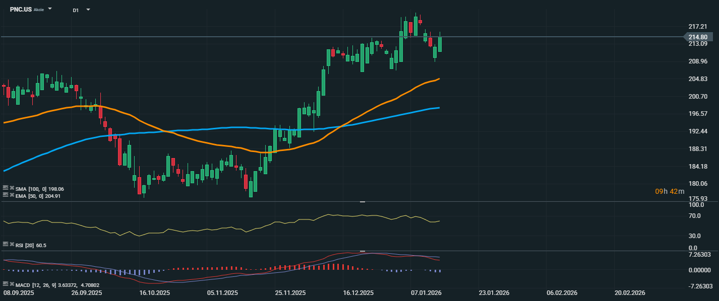 Akcie PNC Financial Services se aktuálně obchodují na úrovni 214,80 USD, přičemž po krátkodobé korekci opět navazují na růstový trend. Cena se stabilně drží nad klouzavými průměry – EMA 50 (204,91 USD) a SMA 100 (198,06 USD) – což potvrzuje býčí technické nastavení. RSI ukazuje na mírně zvýšené nákupní momentum, ale stále se nachází pod úrovní překoupenosti, což ponechává prostor pro další růst. Technicky má nyní cena potenciál k otestování rezistence kolem 217 USD – tedy lokálního maxima z počátku ledna. Naopak support lze sledovat kolem EMA 50 (205 USD), případně dále u psychologické úrovně 200 USD. Dokud se cena drží nad těmito úrovněmi, zůstává výhled pozitivní.