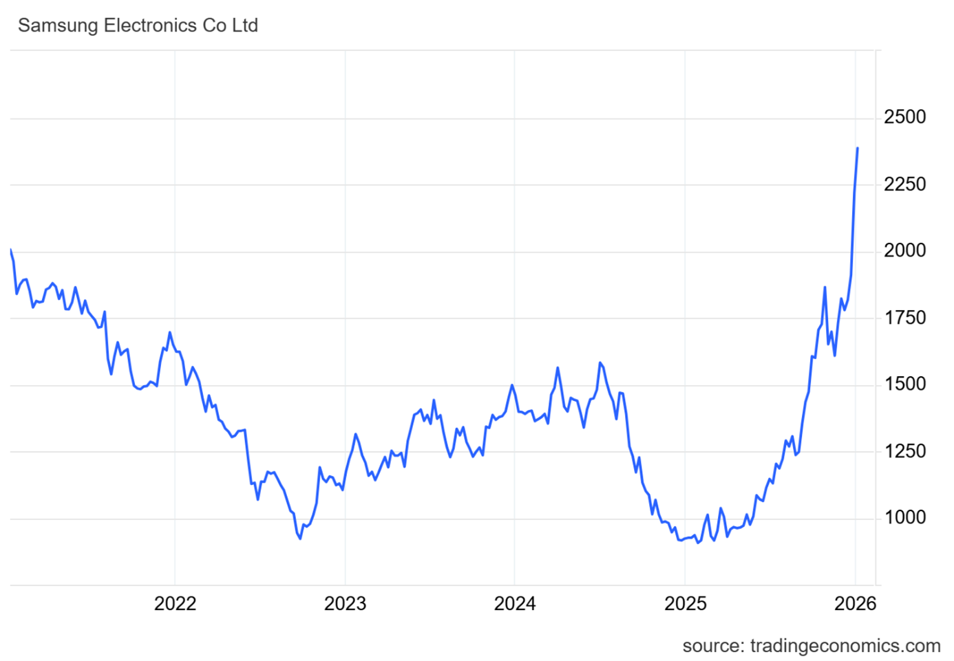Výkonnost ceny akcií společnosti Samsung za posledních pět let