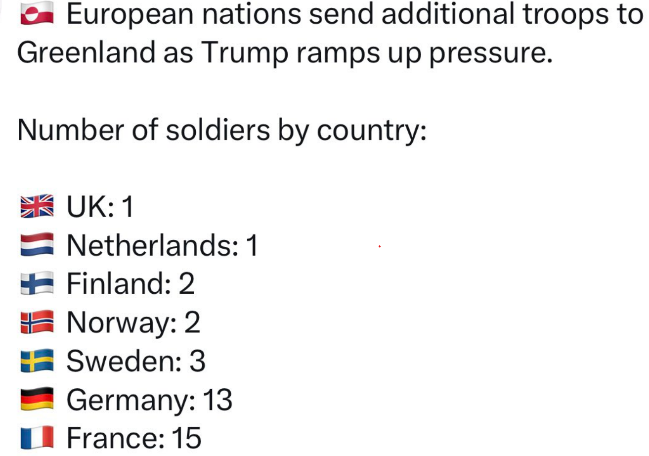 Jedná se až na Dánsko o země, které tento týden do Grónska vyslaly své vojáky, i když v celkovém počtu jen 37 (viz tabulka níže). Dánsko je přidáno zjevně jako země v dané věci „nejvzpurnější“, ovšem z pochopitelného důvodu, když severoamerické Grónsko, největší ostrov světa, představuje autonomní území právě Dánského království.