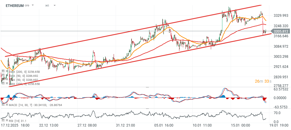 Ethereum se stáhlo k dolní hraně rostoucího cenového kanálu a uptrend zůstává platný, pokud cena neklesne pod 3 200 USD.