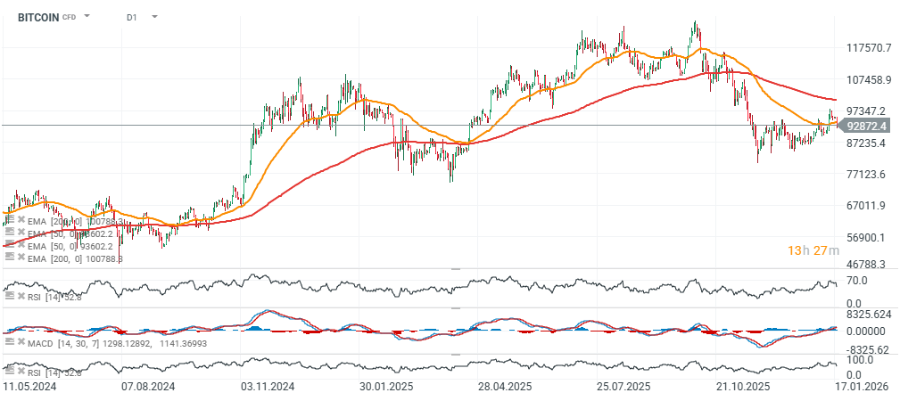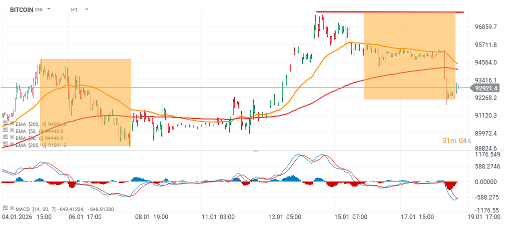 Bitcoin opět klesl pod klouzavý průměr EMA50 (oranžová linie) a nebyl schopen nad touto úrovní setrvat delší dobu. Pokud by se cena během dne vrátila nad úroveň 93 600 USD, mohlo by to naznačit pravděpodobný a rychlý obrat krátkodobého sestupného trendu.