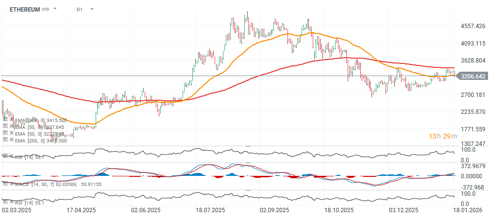Ethereum v poslední době bojuje s průrazem klíčové rezistence, kterou představuje 200denní klouzavý průměr (EMA200) na denním grafu. Aktuálně se zdá, že oblast kolem 3 400 USD je hranicí, která odděluje ETH od širšího býčího trhu. Hlavní úroveň podpory představuje psychologická zóna 3 000 USD, zatímco kupci by měli udržet cenu nad EMA50 (3 200 USD), pokud má momentum zůstat zachováno.