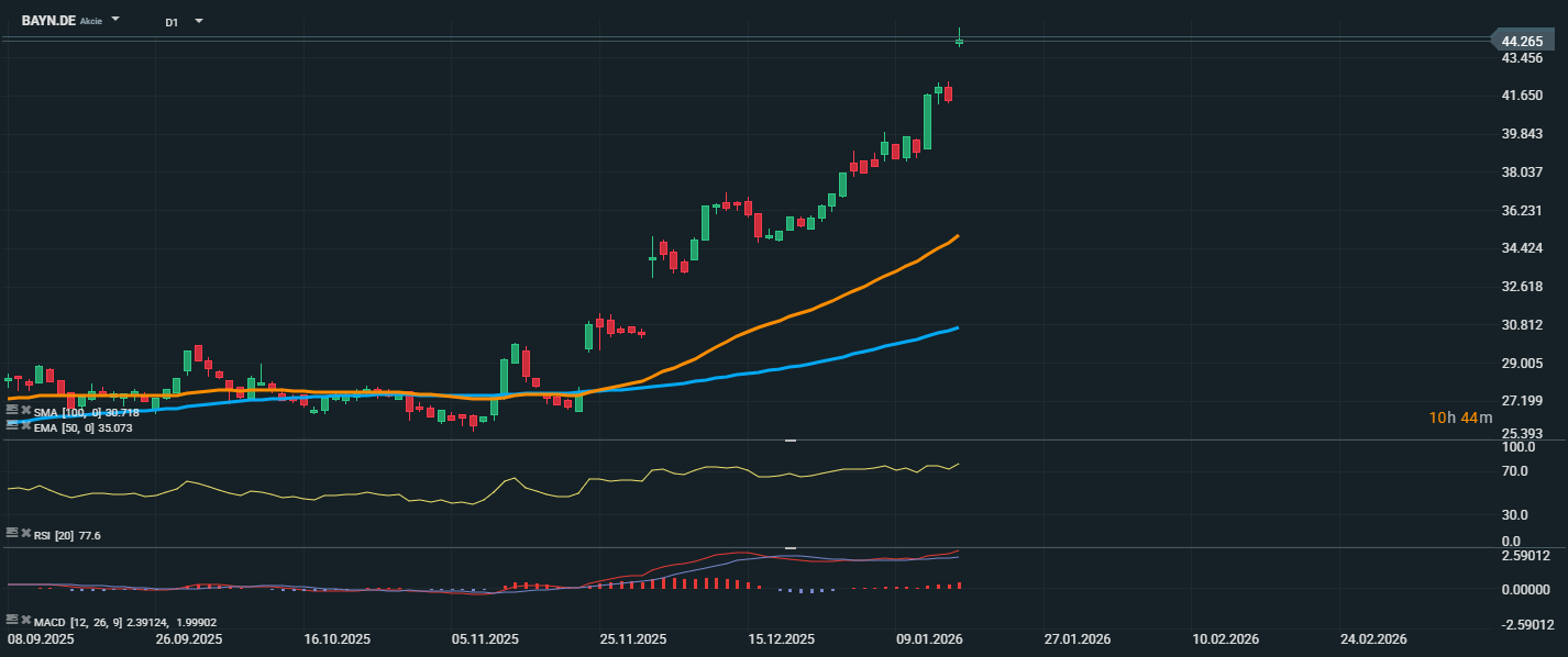 Akcie společnosti Bayer výrazně posílily a aktuálně se obchodují na úrovni 44,27 EUR. Cena se pohybuje výrazně nad klouzavými průměry EMA 50 (35,07 EUR) a SMA 100 (30,78 EUR), což značí jasné býčí nastavení. RSI (77,6) se nachází v zóně překoupenosti, což sice signalizuje silný nákupní zájem, ale zároveň varuje před možností krátkodobé konsolidace nebo korekce. Z technického hlediska je prostor pro růst stále otevřený, ale vzhledem k překoupenému RSI nelze vyloučit krátkodobý výdech či návrat k některé z blízkých supportních hladin – například oblast kolem 41,50–42,00 EUR, případně až k EMA 50.