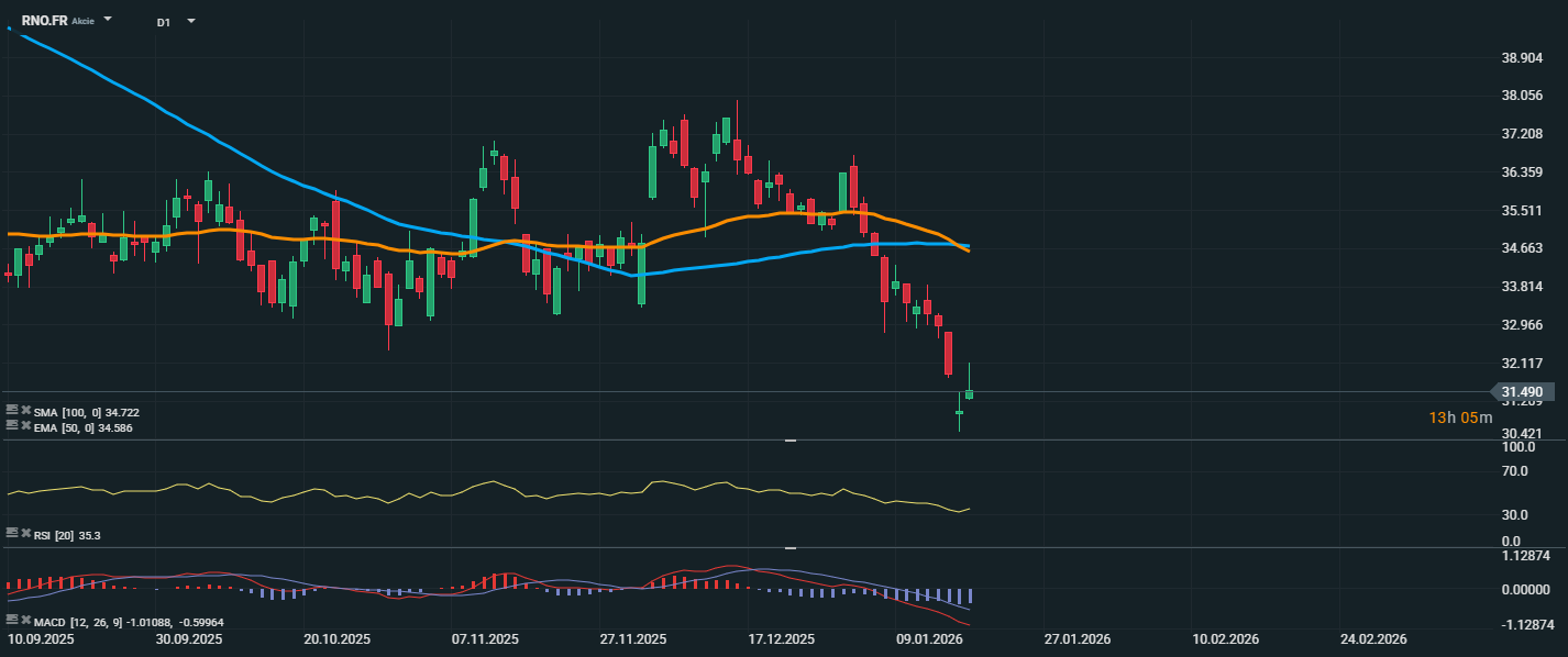 Akcie Renault zažily v posledních týdnech výrazný pokles a aktuálně se obchodují na úrovni 31,49 EUR. Cena se od začátku ledna nachází v silném sestupném trendu a propadla hluboko pod klouzavé průměry EMA 50 (34,59 EUR) a SMA 100 (34,72 EUR), které nyní tvoří silnou rezistenci. V posledních dnech však dochází k mírnému odrazu od nově vytvořeného lokálního minima, což může značit krátkodobý pokus o stabilizaci. Tento pohyb podporuje i indikátor RSI, který se nachází na úrovni 35,3 – tedy blízko přeprodané oblasti, odkud často dochází k technickému obratu nebo konsolidaci. Technická situace tak zatím nenaznačuje obrat trendu, ale spíše možný nádech k vydechnutí po prudkém propadu.