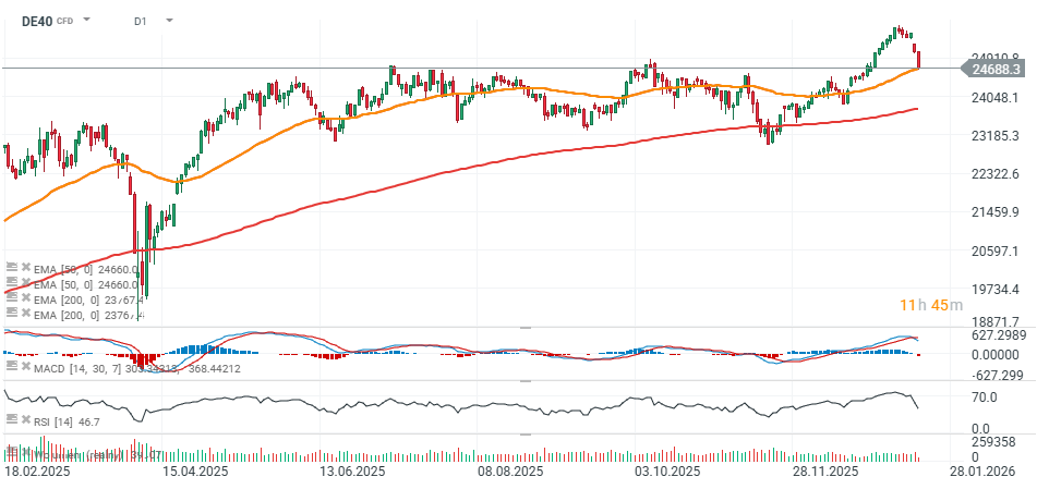 - DE40 se blíží k testu 50denního exponenciálního klouzavého průměru (EMA50). RSI poklesl pod hodnotu 47 a MACD signalizuje medvědí překřížení klouzavých průměrů. Tato úroveň momentálně funguje jako klíčová podpora pro momentum, a pokud bude prolomena, otevírá se cesta k otestování oblasti 24 000 bodů.
