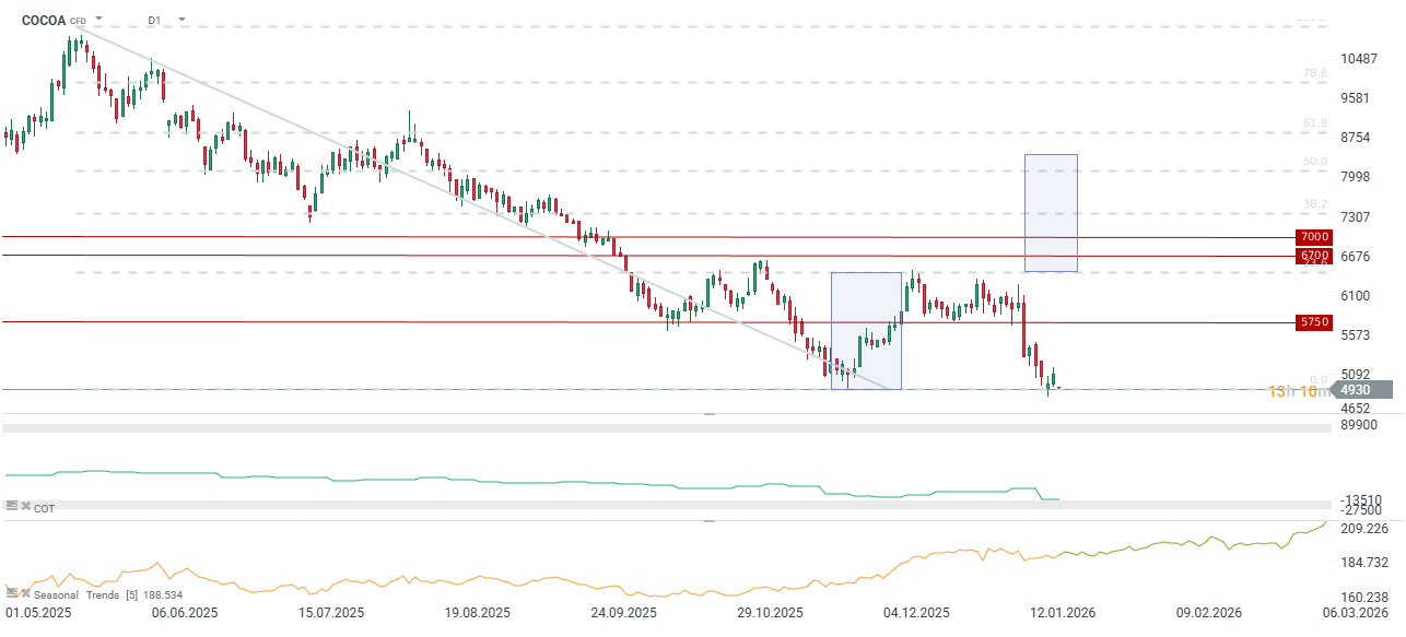 WTI minulý týden výrazně poklesl, protože se zmírnila vnímaná riziková prémie spojená s Íránem. Geopolitická rizika však zůstávají vysoká vzhledem k nestabilní situaci ve Venezuele, Íránu a Rusku, kterou nyní ještě zhoršuje spor o Grónsko. Ceny se v současné době odrážejí od podpory poblíž úrovně 50,0 retracementu. Zdroj: xStation5