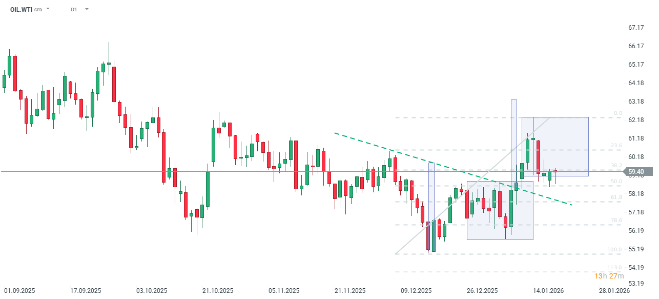 - Donald Trump nyní zaměřil pozornost především na Grónsko, což vedlo k tomu, že ceny ropy Brent a WTI odevzdaly část nedávných zisků. WTI se aktuálně obchoduje poblíž podpory na úrovni 59 USD za barel, níže oproti lednovým maximům kolem 62 USD.