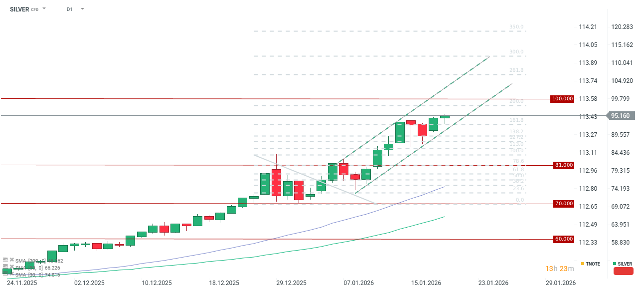 Vzhledem k tomu, že stříbro dosahuje rekordních hodnot, ceny na burze COMEX se přibližují úrovni 100 USD, k dosažení této hranice tedy chybí pouze 5 %. Krátkodobá podpora se ustálila na úrovni 87 USD. Zdroj: xStation5