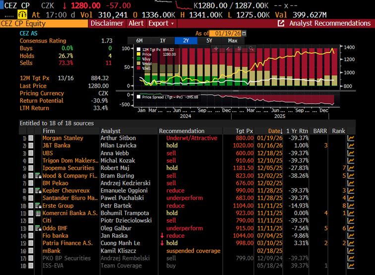 Ostatně, včerejší nová, nižší cílová cena Morgan Stanley, 880 Kč, je pořád notně lepší než cílová cena největší švýcarské banky UBS, stanovená podle Bloombergu 18. 12. 2025 na úrovni pouhých 600 Kč (viz tabulka níže). Přitom loni 18. 12. akcie ČEZ mírně rostly, o 0,2 %. A rostly i den poté (o 1,2 %).