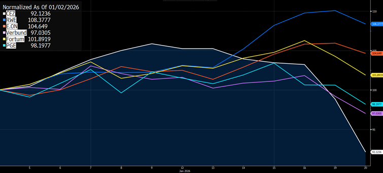 Navíc, včera a dnes ztrácejí akcie ČEZ viditelně výrazněji než akcie srovnatelných evropských energetik (viz graf níže). Německé RWE a E.ON včera dokonce mírně rostly. Polská PGE, rakouský Verbund a finský Fortum dnes i včera klesaly, ale ne tak citelně jako ČEZ. Propad akcií ČEZ tedy musí mít další důvody než jen hodnocení Morgan Stanley nebo nepříznivé mezinárodní klima.