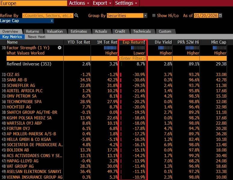 Vládu může k posečkání se zahájením kroků směřujících k zestátnění ČEZ vybídnout také poznatek, že i po včerejším největším propadu za půldruhého roku byl ČEZ podle analytiků nejvíce nadhodnocenou firmou mezi tisícovkou největších burzovně obchodovaných společností Evropy (viz tabulka agentury Bloomberg níže). To, že se za rok touto dobou se dle konsensu analytiků, respondentů Bloombergu, mají akcie ČEZ prodávat o 31 % levněji, je vskutku momentálně činí z tohoto hlediska nejvíce nadhodnocené mezi tisícem největších evropských burzovně obchodovaných firem.