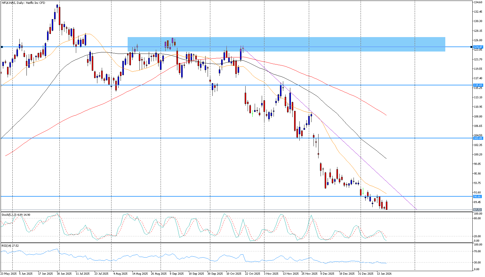 Vývoj akcií společnosti Netflix se výrazně vzdálil dynamickému růstu, který titul předváděl na začátku roku 2025. Od červencového historického maxima na úrovni 133,45 zaznamenaly akcie prudký propad přesahující 30 %, což představuje nejhlubší pokles od roku 2021. Cena se nyní pohybuje v blízkosti devítiměsíčního minima kolem 87,40, což odráží výrazné ochlazení investorského sentimentu. Pozornost trhu se postupně přesouvá od antimonopolních obav spojených s akvizicí Warner Bros. Discovery k nadcházejícímu zveřejnění hospodářských výsledků, které budou oznámeny po uzavření amerického trhu. Očekávání směřují k solidnímu růstu tržeb i zisku na akcii, avšak samotná reakce investorů může být výrazně ovlivněna přetrvávající nejistotou kolem transakce a vývojem počtu předplatitelů. Právě tyto faktory mohou sehrát klíčovou roli při formování krátkodobého směru ceny. Z technického hlediska zůstává obraz spíše slabý. Index RSI se již více než měsíc pohybuje poblíž hranice 30 bodů, což signalizuje přeprodané podmínky a zvyšuje pravděpodobnost krátkodobého technického odrazu. Pro skutečné zlepšení nálady by však bylo nutné prolomení 20denního jednoduchého klouzavého průměru v pásmu 91,00 až 92,50. Takový pohyb by mohl otevřít prostor pro posun k 50dennímu SMA kolem 98,85, přičemž překonání psychologické hranice 100 by následně nasměrovalo pozornost k zóně rezistence 102,70 až 105,00. Pokud však prodejní tlak přetrvá, první významnější podpora se může objevit v oblasti 82,85 až 85,00. Níže by pak hladina kolem 79 bodů mohla fungovat jako další bariéra proti hlubším ztrátám.