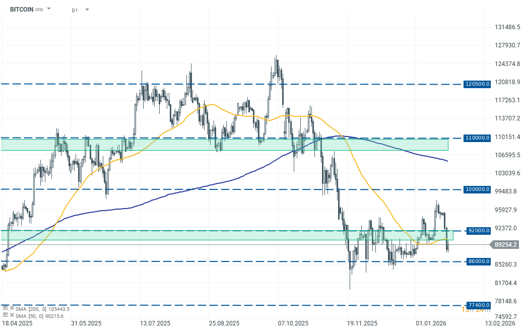 Bitcoin v poslední době prochází obtížným obdobím. Po více než 30% korekci ve 4Q 2025 zůstává největší světová kryptoměna v konsolidaci. V posledních týdnech se Bitcoin pokoušel prorazit směrem vzhůru z tohoto pásma, avšak rostoucí mezinárodní napětí vedlo ke snížení rizikové chuti investorů, což Bitcoin poslalo zpět pod hranici 90 000 USD.