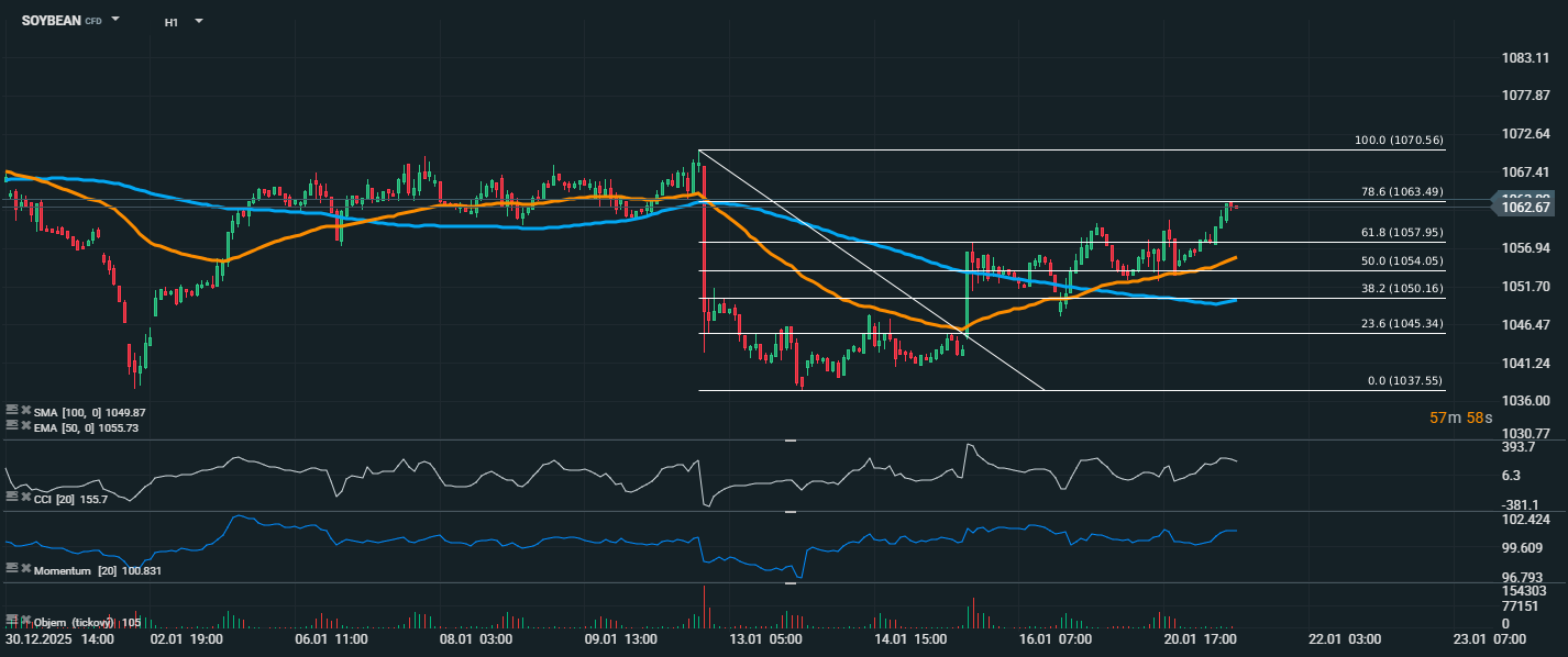 Cena sójových bobů se aktuálně obchoduje kolem úrovně 1062,67 USD, tedy těsně pod klíčovou Fibonacciho hladinou 78,6 % (1063,49 USD), která představuje významnou technickou rezistenci. Trh předtím korigoval hluboký pokles ze začátku ledna, kdy cena klesla z oblasti 1070 USD až na 1037,55 USD. Nynější růst byl doprovázen průrazem klesající trendové linie a současně také průrazem nad EMA 50 (1055,73 USD) a SMA 100 (1049,87 USD), což je silný signál obratu trendu. Indikátory rovněž potvrzují rostoucí momentum – CCI dosahuje 155,7, tedy se nachází hluboko v pásmu překoupenosti, zatímco Momentum je nad hladinou 100, což značí pokračující býčí sílu. Z hlediska technické analýzy bude rozhodující, zda se ceně podaří překonat úroveň 78,6 % retracementu a uzavřít nad 1063,49 USD. Pokud ano, otevře se prostor pro další růst k úrovni 1070,56 USD (100% Fibonacci). V opačném případě může dojít k mírné korekci zpět k hladinám 1057,95 USD (61,8 %) nebo 1054 USD (50 % retracement), které nyní slouží jako podpory.
