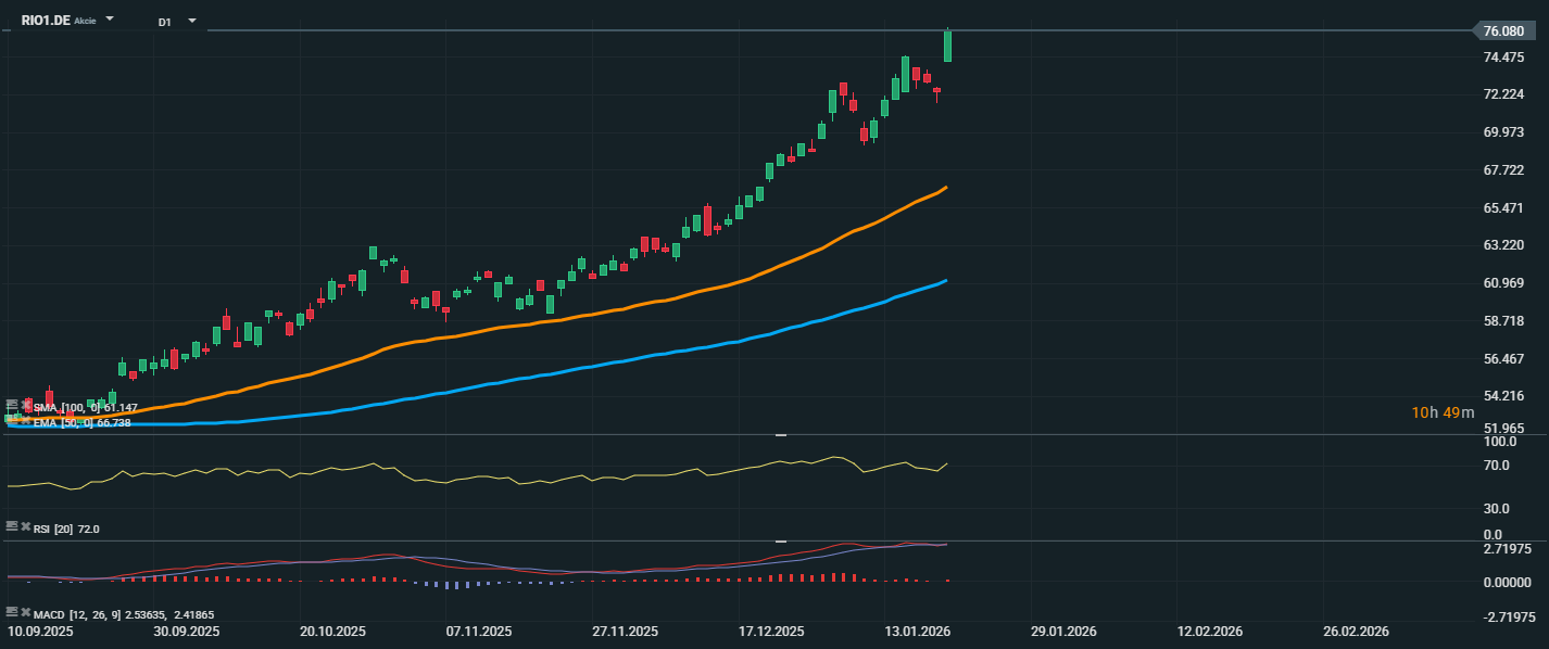 Akcie společnosti Rio Tinto pokračují ve výrazném růstovém trendu, když se aktuálně obchodují na úrovni 76,08 EUR. Cena se nachází výrazně nad klouzavými průměry – EMA 50 (66,74 EUR) a SMA 100 (61,15 EUR) – což potvrzuje silné býčí nastavení trhu. RSI se nachází na hodnotě 72,0, což značí, že akcie jsou v překoupené zóně, ale zatím bez známek zpomalování tempa růstu. Technickou korekci nelze vyloučit, ale pokud bude cena nadále respektovat úroveň EMA 50 jako support, výhled zůstává pozitivní. Krátkodobě může dojít ke konsolidaci v pásmu 72–76 EUR, zatímco překonání hladiny 76 EUR by mohlo otevřít prostor pro další růst.