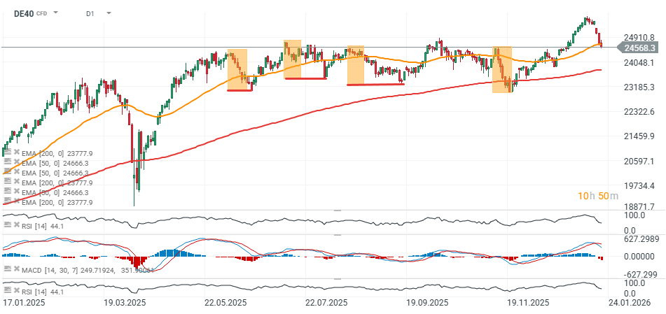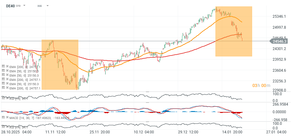 Při pohledu dále do historie překonání 50denního EMA na denním grafu téměř vždy vedlo k urychlení downtrendu. Od května 2025 měly tři klesající impulzy podobné 1:1 projekce, i když jejich rozsah byl mírně menší než u dvou větších korekcí z prosince a – potenciálně – aktuálního pohybu v lednu 2026. Pokud by index otestoval sílu dlouhodobého trendu, mohl by pokles směřovat až k úrovni 23 800 bodů, kde se na denním grafu aktuálně nachází 200denní exponenciální klouzavý průměr (EMA200, červená linie). Naopak, odraz od současných úrovní by mohl znovu nastartovat silný růstový impulz, s potenciální rezistencí poblíž 24 800 bodů, kde se nacházejí dvě lokální maxima z července a října 2025.